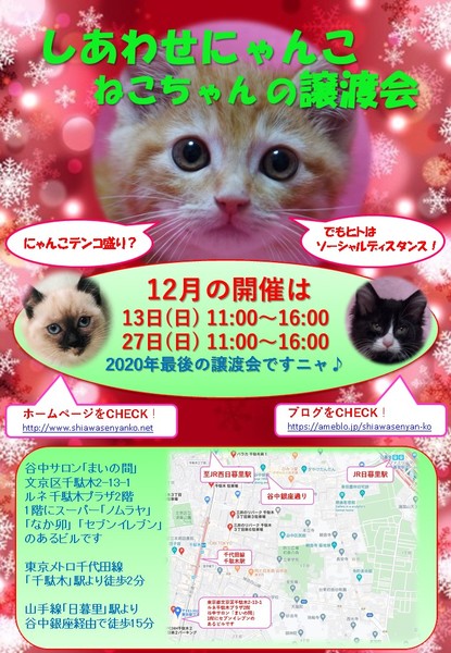 | イベント内容 | 「しあわせにゃんこ」は行き場のない猫ちゃんと里親様との出会いの場を提供するグループです♪ 子猫も成猫もハンデのある猫もみんな新しい家族を待っています♪ みなさまのご来場を保護主、スタッフ一同心よりお待ちしております♪ さぁ2020年もあと1ヶ月! 年末年始を新しい家族と共に過ごしませんか? まだまだご縁を待ってるにゃんこ達が待ってますよ♪ 開催にあたりソーシャルディスタンスを守る為、各種制限等を設けております。 ※詳しくはホームページ譲渡会情報をご確認願います。 http://www.shiawasenyanko.net/jyoutokai.html 猫好きの聖地「谷根千」にて皆様のご来場をお待ちしております♪ ◆開催日/開催時間◆ 2020年12月13日(日) 11:00~16:00 ご希望の猫ちゃんがいらっしゃる場合は11時30分までに受付をお願い致します。 複数のお申し込みがある場合は11時30分で受付を終了させて頂く場合がございます。 受付をされた全ての里親様とお見合いをさせて頂きます。 ※先着順ではございません。 ※当日、猫ちゃんを連れて帰ることは出来ません。 後日調整のうえ保護主が里親様宅へお届けいたします。 ◆会場◆ 東京都文京区千駄木2-13-1 ルネ千駄木プラザ2階 谷中サロン「まいの間」 ※詳しいアクセスはホームページ案内図をご覧下さい http://www.shiawasenyanko.net/mapmainoma.pdf 谷中サロン「まいの間」の情報はこちら http://neko-to-kyo.com/#maima ◆交通手段◆ 東京メトロ千代田線「千駄木」駅より徒歩2分 JR山手線「西日暮里」駅より徒歩12分 JR山手線「日暮里」駅より谷中銀座経由で徒歩15分 ※お車でご来場の際、駐車場のご用意はございません。 近隣のコインパーキング等をご利用ください。※近隣に沢山あります。 いつ里の掲載参加猫一覧はこちらから https://satoya-boshu.net/mypage/foster_list.php?@ps@=none アメーバブログの里親募集にゃんこはこちら https://ameblo.jp/shiawasenyan-ko/theme-10092719565.html ◆猫ちゃんとのお見合い◆ 掲載している猫ちゃんは基本的に譲渡会場でのお見合いのみとなります。 譲渡会への参加が決定している猫ちゃんはその譲渡会で里親様が決定しなかった場合のみ保護主宅でのお見合いが可能となります。 自宅お見合いを希望される里親様はメール(info@shiawasenyanko.net)にてご相談ください。 ◆当譲渡会では猫ちゃんと里親様のスキンシップを大切にしています◆ 新しい家族として20年以上いっしょに暮らしていく猫ちゃんです。 譲渡会場でたくさんの猫ちゃんと触れ合って良きパートナーを見つけてください。 はじめて猫ちゃんを迎える不安や先住猫ちゃんとのトライアルの注意点、猫ちゃんと里親様の暮らし方など気軽にご相談ください。 経験豊富な保護主や猫大好きスタッフがアドバイスさせていただきます。 ◆子猫ご希望の里親様◆ 子猫は急な下痢や発熱等により体調が急変し、数時間対応ができなかっただけでも命を落とす事があります。 その為、当譲渡会では月齢によりお留守番のない又は少ないご家庭への譲渡に限らせて頂いております。 また里親様と子猫ちゃんが安心してトライアル期間を過ごせるよう体重が1㎏程になってからのお届けとさせて頂いております。 ◆里親希望のみなさまへ◆ ご家族の皆様で生涯、家族の一員としてたっぷり愛情を注いでくださるご家庭をお待ちしております。 下記に該当する希望者様へ ・独身、単身者の方 ・友人同士、同棲でのお住まいの方 ・高齢者のみのご家庭の方 は、ご相談の上、譲渡を判断させて頂きます ・適正飼育の不可能な方 ・脱走防止対策にご協力頂けない方 ・定期報告の不可能な方 は、ご遠慮下さいますようお願い致します ◆ご負担頂く費用について◆ 譲渡の際に譲渡負担金(医療費の一部、譲渡金、お届け時の交通費)を里親様にご負担頂く事により 過酷な状況にいる猫ちゃんを保護し新しいご家族の元へ送り出す事ができています。 皆様のご理解とご協力にボランティア一同、心より感謝しております。 ご負担頂く医療費につきましてはホームページに詳しく記載させて頂いております。 http://www.shiawasenyanko.net/onegai.html しあわせにゃんこホームページ http://www.shiawasenyanko.net メールでのお問い合わせ info@shiawasenyanko.net |