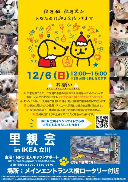 | イベント内容 | << IKEA立川 猫ちゃん・ワンちゃん譲渡会 >> 12月6日 (日)12:00 ~15:00で保護猫・犬の譲渡会を実施しています!! 猫ちゃん・ワンちゃんを家族に迎えたいと思っているお客様に出会いのチャンスです。 日程:12月6日 (日) 時間:12:00 ~15:00 場所:入口横ロータリー ・今回の譲渡会はコロナウイルス感染予防から応募制にしております。 予約ページ: https://www.ikea.com/jp/ja/stores/events/book/14413/ ・欠員等が出た場合、当日会場では整理券を配布いたします。 ※悪天候/動物の体調状況により、時間変更・中止の場合あり ※安全と衛生上の理由につき、イケアストアへのペットのご入館はご遠慮させていただいております。 ※猫ちゃん・ワンちゃんの体調・天候により時間変更・中止にある場合が御座います。 ※当日に猫ちゃん・ワンちゃんをお渡しする事は出来ません。譲渡には条件があり、詳細は当日会場にてご相談ください。 |