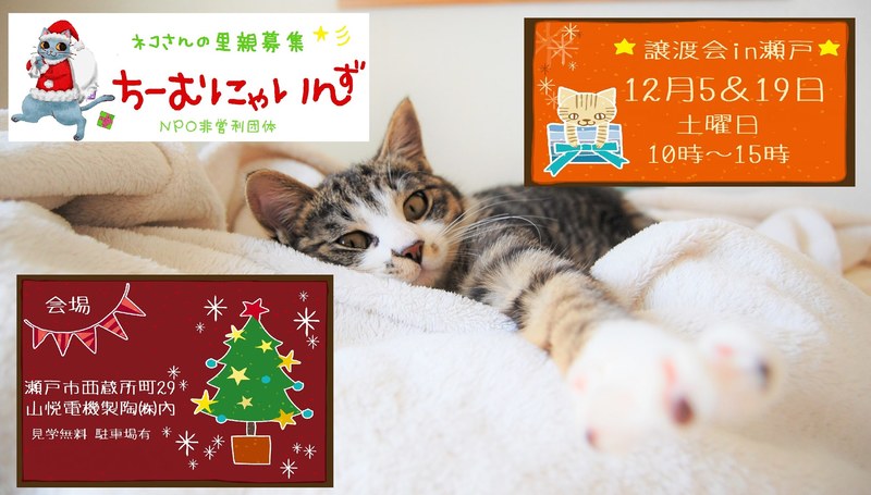 | イベント内容 | 2020年12月5日(第1土曜)&19日(第3土曜)の10時~15時に、瀬戸市内にて『保護猫の譲渡会』を開催します!! 当日は、チビチビの子猫さんから可愛い成猫さんまで、数多くの参加(30匹前後)を予定しております♬ ※見学無料・来場予約不要 猫さんをお探しの方、飼ってみたいと思っている方、いろんな『ネコ話』を聞いてみたい方など、是非お気軽にお越しください! ※新型コロナウイルス感染症拡大防止の為、来場時のマスク着用・検温・アルコール消毒液での除菌・少人数(2~3組)ごとの入場・送風機による場内換気など、様々な制約が生じてしまいますが、何卒ご協力の方をよろしくお願いいたします。 ※コロナ3密対策のため、事前予約のない《他団体のメンバー様》につきましては、ご来場や相談等の対応を一切お断りさせていただいております。 [主催] ちーむ にゃinず (NPO 非営利団体) [開催日時] 2020年12月5日(第1土曜) & 19日(第3土曜) 10時~15時 [譲渡会場] 愛知県瀬戸市西蔵所町29 山悦電機製陶(株)内 駐車場有(14台) ※お車でお越しの方は、場内受付にて駐車場のご案内を致しますので、必ず瀬戸川沿い側(近鉄尾張瀬戸駅の川向い)【ちーむにゃいんず主催 猫の譲渡会】の看板がある、《山悦電機製陶㈱の正面入口》から車で直接入り、すぐ右側の事務所前に設置した入場受付前までお越し下さい。 [ホームページ] 新しくなりました! NEW 「ちーむにゃいんず公式サイト」 http://cat-rescue-team.org/ 現在も随時更新中です!(旧公式HP) 「ちーむにゃいんずamebaページ」 https://team-nyainz.amebaownd.com/ 地域密着型の保護猫団体です! 瀬戸観光協会公式HP内「ちーむにゃいんず」 http://www.seto-marutto.info/member-post/teamnyainz/ [フォローをお願い致します] ちーむにゃいんずFacebook https://www.facebook.com/teamnyainz ちーむにゃいんず Twitter https://twitter.com/nyains_seto [お問合せ] nekomadohouse@yahoo.co.jp ★只今、保護猫ボランティアのメンバーを大募集中です! 現在のところ、主に瀬戸市内中心部で譲渡会を行っておりますが、愛知・岐阜地方を中心にした中部地方全域にその活動エリアを拡大中ですので、少し離れた方でも全然OKです! ・譲渡会当日の各サポーターさん(受付・場内案内・保護主さんのサポートなど) ・譲渡会以外の日の宣伝活動(各媒体での宣伝・チラシ&募金箱等の設置先紹介など) ・チビ猫さんのミルクボランティア ・子猫さん&成猫さんの預かりさん ・保護猫活動及びTNR活動時の捕獲・保護作業 その他、何らかの保護猫活動にメンバーとして協力していただける方は、下記のメールアドレスの方まで、お問い合わせください。 《お問合せ先》 nekomado1@yahoo.co.jp ★NPO非営利団体「ちーむにゃいんず」ボランティア団体登録 ・瀬戸観光協会指定 会員登録団体 ・瀬戸市社会福祉協議会 登録団体 ・瀬戸市民活動センター 登録団体 など |