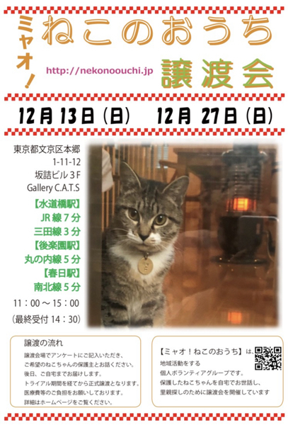 | イベント内容 | 参加する保護猫ちゃんについては、譲渡会一週間前からホームページにてご紹介しております。http://nekonoouchi.jp/ 事前予約はできません。譲渡会場でお会いしましょう。 【新型コロナウイルス対策について】 会場受付にて、以下の点をお願いする予定です。 ✿マスクの着用 ✿手洗いと消毒 ✿連絡先のご記入 御来場者多数の場合には入場制限を設けさせていただきます。 ※当日沢山のご来場者様がいらっしゃった場合、 整理券をお渡しする事がございます。 会場外で長時間お待たせする場合もございますが ご理解くださいますようお願い致します。 皆さまの長時間の在室を避ける為、 希望者様へは後日のご連絡とさせて頂きます。 ※ 感染防止対策時の特例となります。 ◇譲渡に関してのお願い 【ミャオ!ねこのおうち】では譲渡に際して、以下の要件をお願いしております。 ・完全室内飼いで終生愛育 ・脱走させないための対策 ・不妊去勢手術 ・譲渡誓約書の取り交わし ・医療費の一部ご負担 ・記念の写真撮影 ※60才以上の方のみのご家庭、独身や、経済的に困難な世帯、 必要な脱走対策を施していただけない方には原則的に譲渡はご遠慮頂いております。 また、保護主により譲渡条件が異なる場合もございますので会場でご相談ください。 参加予定ねこちゃんは、急な体調不良などで不参加になる場合もございます。 【譲渡に関してのお願い】・【医療費の一部のご負担】・【譲渡までの流れ】など 詳しくは下記ホームページをご覧くださいますよう宜しくお願い致します。 ミャオ!ねこのおうち譲渡会 ホームページ http://nekonoouchi.jp 公式facebookページ https://www.facebook.com/myaoneko.ginza/ 公式instagram https://www.instagram.com/myaoneko.ginza/ |