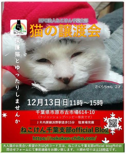 | イベント内容 | 春から夏に生まれた子猫を中心とした譲渡会です。 今回も通常スタイルの譲渡会と変更致しますが、コロナウイルス対策として ・会場内ではマスクのご着用と入退室の際は消毒をお願い致します。 ・混雑時には時間をずらしてのご入場とさせていただく場合がございます。 ご協力の程よろしくお願い致します。 成猫は指名制のお見合いとさせていただく子もおりますので、 『◯◯ちゃんと、お見合い希望』とご指名の事前申し込みをお願い致します。 ねこけん千葉支部のブログ内にありますお問い合わせフォームより、 ⚫︎お名前 ⚫︎ご住所(市区町村までで大丈夫です) ⚫︎お見合いご指名猫の名前を、お知らせください。 ※締め切りは譲渡会前日11月12日(土)18時までとなっております。 ねこけん千葉支部ブログ→ https://ameblo.jp/nekoken-chiba/ また、譲渡会会場では、千葉県内にお住いの預かりボランティアさん及びお世話ボランティアさんを募集しています。 ご希望の方は、大変お手数をおかけしますが、譲渡会までお越しください。 ※ご都合がつかない場合は、お問い合わせ先までご相談ください。 [日時] 12月13(日)11:00~15:00 [会場] 千葉県市原市古市場614-10 ※屋内での開催となり雨天決行です。 ※抱っこもOK! ※猫ちゃんの負担も考え、ご来場は時間内にお願い致します。 ※特にご予約などは必要ございませんのでご家族皆様でぜひお越し下さい。 ※駐車場あり。 [交通] 交通機関を利用してお越しの方 JR内房線 浜野駅より徒歩13分 浜野駅は、東京駅から京葉線→内房線でおよそ50分の距離!! お車でお越しの方 京葉道路蘇我インターより車で10分 ※駐車場はラジコンショップハッピー様裏手にございます駐車場をご利用ください [譲渡ご希望の方へのお願い] 誠に恐れ入りますが下記に当てはまります方への譲渡は不可となりますので予めご了承下さい。 ①学生さん、未成年の方、安定収入のない方 ②ペットを飼う事を許されていない住宅にお住まいの方 ③身体的、精神的疾病で治療中の方 ※60歳以上の方は別途条件がございますのでご相談下さい。 [譲渡の流れ] お申込み→審査→後日お届け→トライアル→正式譲渡 ※当日のお連れ帰りは出来ませんので予めご了承ください。 ※仮譲渡時にご希望の猫ちゃんにかかった医療費(血液検査・ワクチン・駆虫・不妊去勢手術等)をご負担願います。 しかし、正式譲渡に至らなかった場合は医療費を全額返済致します。 [主催] 動物愛護団体 NPO法人ねこけん 千葉支部 [ブログ] https://ameblo.jp/nekoken-chiba/ [参加動物] 成猫・子猫(ねこけん保護猫以外の猫ちゃんも参加予定です) [お問い合わせ] ご不明な点、ご質問等ございましたら下記までお問い合わせください。 chiba.info@nekoken.jp ※譲渡会へお越しの際、特に予約等必要ありません。 |