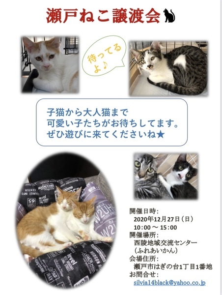| イベント内容 | 今年最後の譲渡会★ 年末年始はニャンコに癒されながら過ごしませんか!? 今月も、子猫から大人猫まで、いろんな柄の可愛い子達が参加します。 コロナ感染拡大防止対策もバッチリです。 ・ご自宅にて体温計測をし、37.5℃以上の方はご来場をお控えください。 ・お越し頂いた方のお名前とお電話番号を控えさせていただきます。 ・入室時、消毒と検温をしていただきますようお願いします。 ・定期的に換気をします。 ・一度に入室する人数を制限させていただきます。 ご不便をお掛けする事もあるかもしませんが、ぜひ遊びに来てくださいね! |