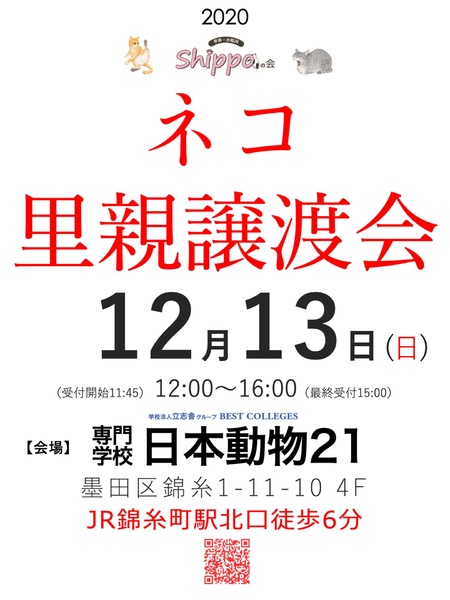| イベント内容 | 東京 錦糸町の専門学校日本動物21様のご協力により、同校舎にて猫の里親譲渡会を開催させていただきます。 参加猫さんはこちらからご覧下さい。(随時更新) https://www.pet-home.jp/member/user360938/post/ ●日時:12月13日(日) 12:00~16:00 (入場受付11:45 最終受付15:00) ●会場:専門学校 日本動物21 墨田区錦糸1-11-10 4F ●アクセス:JR総武線・総武快速線「錦糸町駅」 北口徒歩6分/東京メトロ半蔵門線「錦糸町駅」 3出口徒歩6分 【開催時間】 ●11:45受付開始 12:00開場 ●15:00最終受付 16:00閉場 日本動物21様への電話での問合せは、ご遠慮ください。 ※東京都墨田区錦糸1-2-1(アルカタワーズ)は同校の法人本部です。 里親譲渡会の会場ではございませんので、お間違いのないよう御願い致します。 感染対策として、ご来場の際は「マスク着用」「入り口でのアルコール消毒」「検温・アンケート・問診票の記入」のご協力をお願いしております。 『三密』を避けるため、以下のように対応させていただきます。 *会場入場者数を制限する場合がございます *窓を開けての外気換気を行いますので、猫さんをケージの外に出すことはできません *会場には待機場所のご用意はございません ご理解いただきますよう、お願いいたします。 子猫ちゃんたちも参加予定なので、小さい頃から一緒に暮らしたい、育てたいとお考えの方、ぜひお越しください! 男性の一人暮らしの方やご高齢の方にもぴったりの、まったりした大人猫さんたちも参加予定です。 きっと、運命の出会いがあると思います。 里親希望の皆さま、ぜひ、足をお運びください! ●参加猫および諸条件については、下記「ペットのおうち」からご覧ください。(随時更新) https://www.pet-home.jp/member/user360938/post/ 猫さんの状況により、当日不参加になる場合があります。 当日ご希望の猫さんを連れて帰ることはできません。 トライアル決定後、後日ご自宅までの送り届けとなります。 ☆譲渡には当会における一定の条件があります。 ☆当会および里親譲渡会についてのお問い合わせ ☆外猫、保護猫のために物資のご支援を頂ける方がおりましたら、送付先をご連絡させて いただきますのでご連絡下さい。 ☆預かりボランティアさん、活動のお手伝いをして頂ける方も随時募集中です。 hilakoma@yahoo.co.jp |