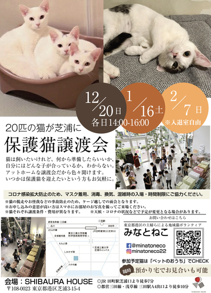| イベント内容 | 東京都内を中心に年間200匹以上の譲渡を行なっている、みなとねこが田町駅芝浦口で譲渡会を開催します。 できれば預かり宅で普段の元気いっぱいな姿をみていただきたい。けれど、ご希望の方全員にお越しいただくのは難しい。 里親希望の方にしても一度見てから考えたい、わざわざお見合いに行ってしまうと断りづらいんじゃないかというお気持ちもあると思います。 そこで毎月譲渡会を行なってきました。 7月からは地元港区内の開放的な素敵なレンタルスペースで開催しています。 今回も子猫中心に20匹程度、生後2-10ヵ月、大人猫も参加します。 みなとねこは今後もまだまだたくさんの子猫の保護の予定があります。また子猫をお迎えいただくにはそれなりにご準備も必要ですので、今すぐは難しい方にもご希望の猫の条件をお伺いして、該当の猫が出てきたらご紹介という形で今まで以上にスピーディーでかつミスマッチのない譲渡を目指します。 ただ子猫は圧倒的に春に生まれ秋や冬にはあまり生まれません。のんびりしてると小さい子ほど早く決まってしまいます。 みなとねこは子猫は2匹ペアでの譲渡が原則です。 初めての方こそ最初から2匹をお勧めしています。 また私たちボランティアはご縁のあった猫たちに終生里親様に愛されて幸せに安全に暮らして欲しいと願っています。 このため里親になっていただくにはいくつかの条件やお約束事があります。 ■里親申込 事前誓約書 adobe.ly/35jdcb2 会場では申込書とお部屋のお写真を拝見してお迎えまでにご準備いただきたいことなどご説明します。 ■里親申込書 adobe.ly/2HqP1iI 会場にてご記入いただくことも可能ですが、お手元で印刷可能でしたら、ご記入の上ご来場いただくことをおすすめしております。 ※事前誓約書の3と4に該当がある方は是非事前にご相談ください。 また猫それぞれの月齢や保護主の考えにより、譲渡条件が加わる場合があります。 また新型コロナの感染拡大防止の観点から混雑時は入場をお待ちいただいたり、 マスクの着用と消毒のご協力をお願いしております。換気のためにドアをオープンしての開催のためにケージ越しでのご対面となりますことご理解ください。 実際の参加予定猫は12/20(日)20:00までにFacebookページでご紹介します。 https://m.facebook.com/minatoneco/ |