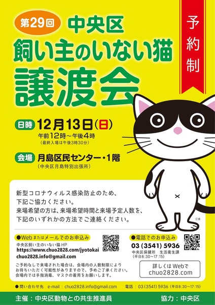 | イベント内容 | ゚・*:.。. .。.:*・゜゚・*:.。. .。.:*・゜゚・*:.。. .。.:*・゜゚・*:.。. .。.:・゜ 「中央区 飼い主のいない猫 譲渡会」に参加予定です .。.:*・゜゚・*:.。. .。.:*・゜゚・*:.。. .。.:*・゜゚・*:.。. .。.:*・゜゚・*:.。. 東京都中央区月島区民センター 1階 会議室で、猫の譲渡会を開催されます。 主催 : 中央区動物との共生推進員 協力:中央区保健所 開催日 : 12月13日(日)12時〜16時(最終入場15時30分) 会場 : 東京都中央区月島4丁目1-1 月島区民センター 1階 会議室 地下鉄 有楽町線 月島駅 徒歩3分 地下鉄 大江戸線 月島駅 徒歩3分 今回は、感染予防対策として、事前予約制となっています。 こちらのWebサイトよりお申し込みください。 https://www.chuo2828.com/jyotokai ⭐️猫の譲渡に関しては、猫によって譲渡の、条件が異なりますので、会場で保護主と、直接、お話していただくよう、お願いしております。 ⭐️ 里親お申し込みをされる場合は、ご本人確認をさせていただきますので身分証明書をご持参ください。 ⭐️ 仔猫については、体調が不安定な為、留守時間の長い方や、一人暮らしの方などは、お勧めすることができませんので、ご了承ください。 ⭐️当日は、猫を連れて帰ることは、できません。 保護主と、日時を相談していただき、自宅までお届けいたします。 ⭐️1匹の猫に対して、複数の希望があった場合、里親さまの生活スタイルや 猫の年齢などを考慮させていただくことを、ご了承ください。 ⭐️参加予定の猫は、体調不良などにより、不参加になることがありますが、ご了承ください。 詳しくは、ブログをご覧ください。 https://www.chuo2828.com/ 【お問い合わせ先】 chuo2828.info⚫︎gmail.com 又は、 minimyu2014⚫︎yahoo.co.jp ⭐️迷惑メール防止の為、@を⚫︎で表示しています。 【お急ぎの方は】 電話:090-4412-6396 竹内(中央区動物推進員) ご連絡は、昼12時〜夜12時で、お願いします。 |