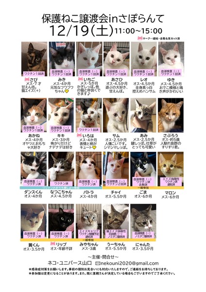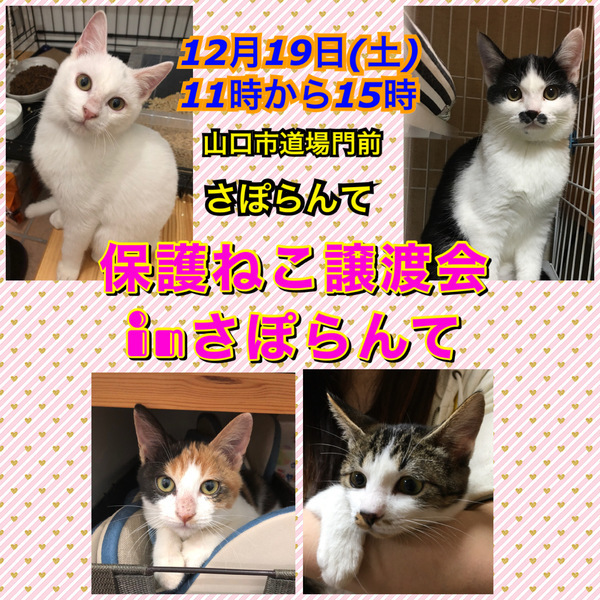| イベント内容 | 保護猫ちゃんに会いに来てね。 12月19日(土)に山口市の『さぽらんて』で「保護ねこ譲渡会」(ボランティア合同開催)が開催されます。 時間は11時から15時まで。 子猫達は写真で見るより実際に見てもらった方が可愛いと思います。ぜひ足をお運びいただいて、運命の子との出会いを見つけてください。 *譲渡には条件がありますので、気になる子がいましたらお問い合わせください。 *参加予定ねこちゃんは当日変更になる場合があります。 *チャリティーバザーもあります。 |