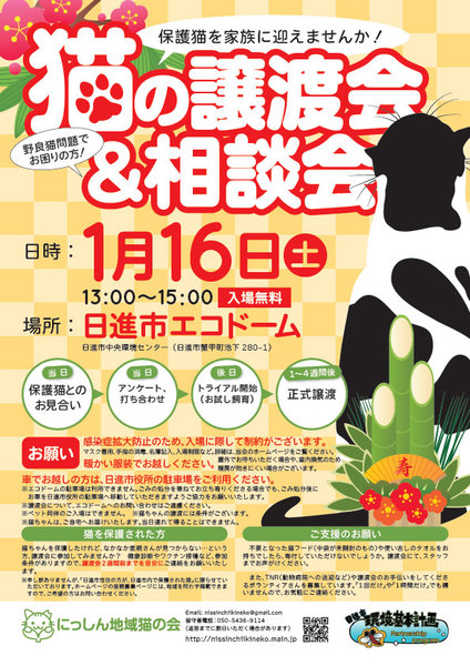 | イベント内容 | 1月16日(土)に「猫の譲渡会」を開催いたします。 猫少なめのミニ譲渡会&相談会です。 保護猫を迎えたい方はもちろん、ご近所との猫トラブルなどでお悩みの方もお立ち寄りください!(^^)/ 感染症拡大防止のため、入場に際して制約がございますので、ご理解・ご協力をお願いいたします。詳細は、ホームページにて随時更新いたします。 【日時】2021年1月16日(土)13:00〜15:00 【会場】日進市エコドーム(中央環境センター) ※入場無料・予約不要です。 ※ペット同伴のご入場はできませんので、予めご了承ください。 ※猫ちゃんの譲渡には条件がございます。詳細はホームページをご参照ください。 ※車でお越しの方は、日進市役所の駐車場をご利用ください(徒歩1分)。エコドームの駐車場は、ごみを持参される方専用のため、利用できません。ごみの処分を兼ねてお立ち寄りくださる場合でも、誠にお手数ですが、ごみ処分後にお車を日進市役所の駐車場へ移動していただきますよう、どうぞご協力をお願いいたします。 【主催】にっしん地域猫の会 【ホームページ】http://nissinchiikineko.main.jp |