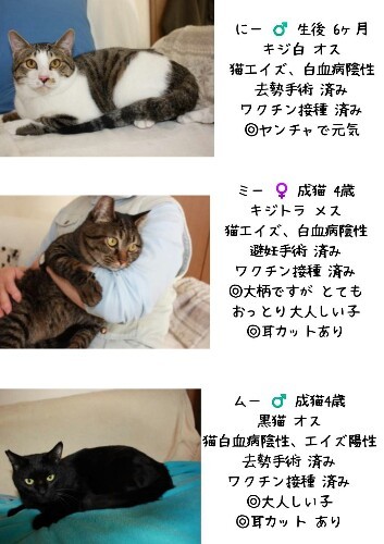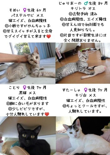 | イベント内容 | 猫の譲渡会inシュシュ岡山 日時 : 2/17(日)13:00~15:00 場所 : Chou chou岡山店 岡山県岡山市北区今2-1-29 (店内 保護犬コーナー前スペースにて) 当日は生後6ヶ月〜成猫までの 10匹ほどの保護猫が参加します。 ※ ご厚意で譲渡会場をお貸しして下さっています。 ご迷惑になりますので今回の譲渡会の事で Chou chouさんに問い合わせをされない様 お願い致します。 ↓詳しくはこちらのブログをご参照下さい。 いっちーの幸せ探し 〜岡山、倉敷より保護猫ブログ〜 https://ameblo.jp/chiiichiiichiiichiiichii/ 岡山 猫の保健室むーちょ https://ameblo.jp/gato-mucho/ あにまるほぉだぁshow? http://2435apdj.blog.fc2.com/ |