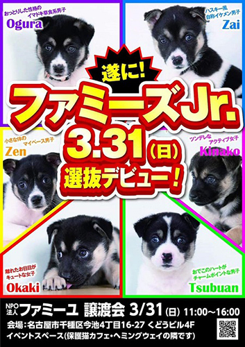 | イベント内容 | NPO法人ファミーユの仔犬の里親会 参加予定の仔犬はコチラ http://www.npo-famille.org 可愛い仔犬が家族を探しています! ※同時にバザーも開催 ※お車でお越しの方は近隣に有料パーキングがたくさんあります ※当日に仔犬はお渡しできません(後日お届けします) ※譲渡条件などがございます(完全室内飼育など…当日ご確認ください) ⭐︎希望の仔犬がいましたら、前もってお問い合わせいただくとスムーズです ⭐︎優しいみなさまのお越しをお待ちしています! |