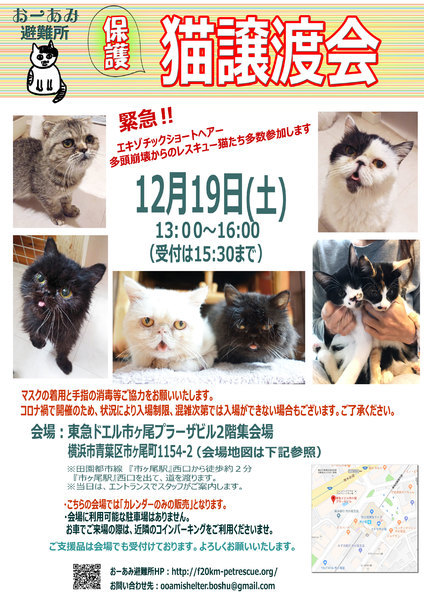 | イベント内容 | ☆★☆★☆★☆★☆★☆★☆★☆★☆★☆★☆★☆★☆★☆★☆★☆★☆★☆★☆ ~12月19日(土)市ヶ尾にて譲渡会開催!~ 参加予定の猫さんの紹介(一部ですが)はこちらからご覧ください! https://youtu.be/-sd9MrSSMvk ◎場所・・「東急ドエル市ヶ尾プラーザビル2階集会場」 神奈川県横浜市青葉区市ヶ尾町1154-2 田園都市線「市ヶ尾」駅西口より徒歩約2分 ◎日程・・12月19日(土)(雨天決行) ◎時間・・13時から16時(受付は15時30分まで) (会場に利用可能な駐車場はございません。近隣のコインパーキングをご利用ください。) *コロナ禍での開催につき、状況により入場制限し、混雑次第で入場お断りせざるを得ない場合もあることをご了承ください。 *参加の際は、マスクの着用、アルコール消毒のご協力をお願いいたします。 *当日は検温の上、体温が37度以上の方はご参加いただけません。 *混雑状況により、中止させていただく場合がございます。 ※参加予定の犬猫は体調により参加できない場合があります。ご了承ください。 ☆★☆★☆★☆★☆★☆★☆★☆★☆★☆★☆★☆★☆★☆★☆★☆★☆★☆★☆ |
