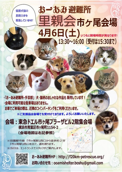 | イベント内容 | 【いつもより30分遅い開始です ご注意ください】 可愛い仔犬・仔猫・成猫がたくさん、出場しますよ! 当日にはご来場できないかたも、ぜひお問い合わせください。 別日にお見合いの設定も可能です。 どうぞ、よろしくお願いします。 ☆★☆★☆★☆★☆★☆★☆★☆★☆★☆★☆★☆★☆★☆★☆★☆★☆★☆★☆ ~4月6日(土)市ヶ尾にて里親会開催!~ ◎場所・・「東急ドエル市ヶ尾プラーザビル2階集会場」 横浜市青葉区市ヶ尾町1154-2 東急田園都市線「市ヶ尾」駅より徒歩2分 ◎日程・・4月6日(土)(雨天決行) ◎時間・・13時半から16時(受付は15時30分まで) ◆いつもより30分遅い開始時間です! (駐車場はございません。お車でお越しの際は近隣のコインパーキングをご利用ください) ■当日ご来場の方全員にアンケートを記入して頂きます。 ■下記リンクより事前にアンケートをご記入いただくと、待ち時間が短縮されます。 ★ 猫ご希望のかた向けアンケート https://goo.gl/ZNRFtI ★ 犬ご希望のかた向けアンケート https://goo.gl/pwWUMj ■アンケートで頂戴した個人情報は適切に管理し、里親さま決定のための資料としてのみ使用いたします。 ■アンケートをご提出いただいても、譲渡をお約束するものではないことをご承知置きください。 ※参加予定の猫は体調により参加できない場合があります。ご了承ください。 ※詳細はお問い合わせいただくか、ブログ・HPをご覧くださいませ。 おーあみ避難所ブログ:http://ameblo.jp/oami-hinanjyo おーあみ避難所HP:http://www.geocities.jp/oami_hinanjyo/ ☆★☆★☆★☆★☆★☆★☆★☆★☆★☆★☆★☆★☆★☆★☆★☆★☆★☆★☆ |