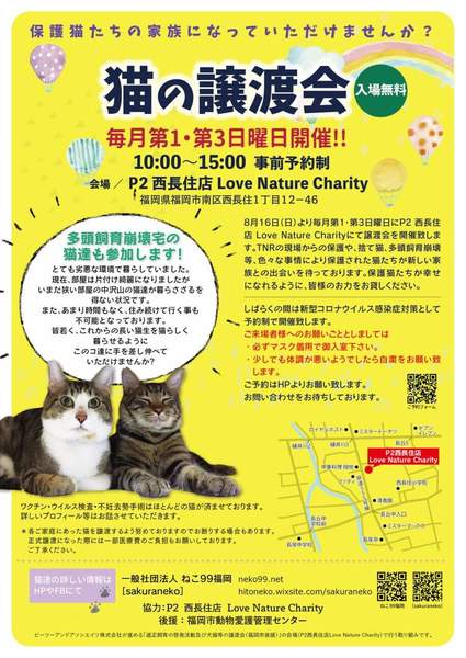 | イベント内容 | P2様のご協力により毎月第1・第3日曜日に 西長住店敷地内のLove Nature Charity棟内にて譲渡会を開催できる事となりました。 TNRの現場からの保護や、捨て猫、多頭飼育崩壊等、色々な事情により保護された猫たちが新しい家族との出会いを待っております。保護猫たちが幸せになれるように、皆様のお力をお貸しください。 しばらくの間は新型コロナウイルス感染症対策として予約制で開催致します。 ご来場者様へのお願いごととしましては ・必ずマスク着用で御入室下さい。 ・少しでも体調が悪いようでしたら自粛をお願い致します。 ご予約につきましてはこちらのフォームよりご連絡をお願いします。 https://hitotoneko.jimdofree.com/form/ * 保護した子達には、必ず幸せになってもらいたい。 その為にも、譲渡をするにあたり条件がございます。 どうかご理解のほどよろしくお願いいたします。 ?福岡市内及び近郊限定募集。 ?ペット可住居にお住まいの方。 ?完全室内飼い・脱走対策をしていただける方。 ?ご家族皆様の同意を得られる方。 家族の一員として最後まで飼っていただける方。 ?単身者、60歳以上の方にはご相談、または お断りをさせていただいております。 ?毎年のワクチン接種をしていただける方 ?ご負担にならない程度で近況報告をいただける方 ?医療費の一部をご負担いただける方 (初期検査・ワクチン・等)の費用。※明細書があります) ?譲渡誓約書への署名をご了承いただける方 ?引き渡し方法 希望者様宅にお連れし、家庭訪問等させていただきます。 お試し期間としてトライアルしていただいたのち、家族として迎えて良いと判断いただけましたら再訪させていただいて、譲渡契約書をかわさせていただきます。 お話がまとまった場合は、身分証の提示や誓約書の記載をお願いしております。 里親詐欺等がございます。 ご理解いただけると助かります。 この子達の他にも里親さんを募集したい子達がたくさんいます。 継続的な活動の為にも、医療費の一部をご負担ください。 動物病院から発行された領収書をお渡し致します。 ?せっかくつながった命です。大切な家族の一員として迎え入れてくださる飼い主さんを探しています。 写真や文章では伝わらない保護猫達の本当の姿をご覧になって、家族の一員に迎え入れていただけたらと思います。 どうぞよろしくお願い致します。概要こちらから→https://hitoneko.wixsite.com/sakuraneko/events/neko99fukuoka-kakeru-sakuraneko-godojotokai-9 |