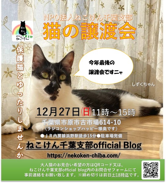 | イベント内容 | 夏から秋に生まれた子猫を中心とした譲渡会です。 今回も通常スタイルの譲渡会と変更致しますが、コロナウイルス対策として ・会場内ではマスクのご着用と入退室の際は消毒をお願い致します。 ・混雑時には時間をずらしてのご入場とさせていただく場合がございます。 ご協力の程よろしくお願い致します。 成猫は指名制のお見合いとさせていただく子もおりますので、 『◯◯ちゃんと、お見合い希望』とご指名の事前申し込みをお願い致します。 ねこけん千葉支部のブログ内にありますお問い合わせフォームより、 ⚫︎お名前 ⚫︎ご住所(市区町村までで大丈夫です) ⚫︎お見合いご指名猫の名前を、お知らせください。 ※締め切りは譲渡会前日12月26日(土)18時までとなっております。 ねこけん千葉支部ブログ→ https://ameblo.jp/nekoken-chiba/ また、譲渡会会場では、千葉県内にお住いの預かりボランティアさん及びお世話ボランティアさんを募集しています。 ご希望の方は、大変お手数をおかけしますが、譲渡会までお越しください。 ※ご都合がつかない場合は、お問い合わせ先までご相談ください。 [日時] 12月27(日)11:00~15:00 [会場] 千葉県市原市古市場614-10 ※屋内での開催となり雨天決行です。 ※抱っこもOK! ※猫ちゃんの負担も考え、ご来場は時間内にお願い致します。 ※特にご予約などは必要ございませんのでご家族皆様でぜひお越し下さい。 ※駐車場あり。 [交通] 交通機関を利用してお越しの方 JR内房線 浜野駅より徒歩13分 浜野駅は、東京駅から京葉線→内房線でおよそ50分の距離!! お車でお越しの方 京葉道路蘇我インターより車で10分 ※駐車場はラジコンショップハッピー様裏手にございます駐車場をご利用ください [譲渡ご希望の方へのお願い] 誠に恐れ入りますが下記に当てはまります方への譲渡は不可となりますので予めご了承下さい。 ①学生さん、未成年の方、安定収入のない方 ②ペットを飼う事を許されていない住宅にお住まいの方 ③身体的、精神的疾病で治療中の方 ※60歳以上の方は別途条件がございますのでご相談下さい。 [譲渡の流れ] お申込み→審査→後日お届け→トライアル→正式譲渡 ※当日のお連れ帰りは出来ませんので予めご了承ください。 ※仮譲渡時にご希望の猫ちゃんにかかった医療費(血液検査・ワクチン・駆虫・不妊去勢手術等)をご負担願います。 しかし、正式譲渡に至らなかった場合は医療費を全額返済致します。 [主催] 動物愛護団体 NPO法人ねこけん 千葉支部 [ブログ] https://ameblo.jp/nekoken-chiba/ [参加動物] 成猫・子猫(ねこけん保護猫以外の猫ちゃんも参加予定です) [お問い合わせ] ご不明な点、ご質問等ございましたら下記までお問い合わせください。 chiba.info@nekoken.jp ※譲渡会へお越しの際、特に予約等必要ありません。 |