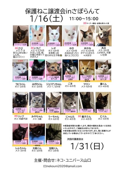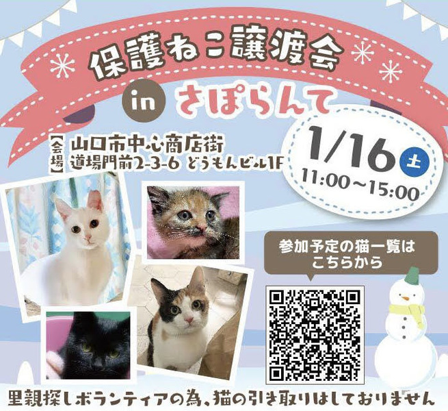 | イベント内容 | 多くの保護猫ちゃんが待ってます。 1月16日(土)と31日(日)に山口市の『さぽらんて』で「保護ねこ譲渡会inさぽらんて」(ボランティア合同開催)が開催されます。 時間は11時から15時まで。 子猫達は写真で見るより実際に見てもらった方が可愛いと思います。ぜひ足をお運びいただいて、運命の子との出会いを見つけてください。 *譲渡には条件がありますので、気になる子がいましたらお問い合わせください。 *参加予定ねこちゃんは当日変更になる場合があります。 *チャリティーバザーもあります。 *感染症予防対策は会場でも行っておりますが、各自でも宜しくお願い致します。 |