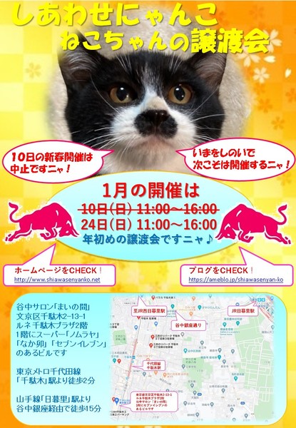 | イベント内容 | 「しあわせにゃんこ」は行き場のない猫ちゃんと里親様との出会いの場を提供するグループです♪ 子猫も成猫もハンデのある猫もみんな新しい家族を待っています♪ みなさまのご来場を保護主、スタッフ一同心よりお待ちしております♪ 感染爆発の状況を考慮し10日の開催は中止とさせて頂きます。 ご来場予定だった皆様には本当に申し訳ございません。 開催にあたりソーシャルディスタンスを守る為、各種制限等を設けております。 ※詳しくはホームページ譲渡会情報をご確認願います。 http://www.shiawasenyanko.net/jyoutokai.html 猫好きの聖地「谷根千」にて皆様のご来場をお待ちしております♪ ◆開催日/開催時間◆ 2021年1月10日(日) 11:00~16:00 ご希望の猫ちゃんがいらっしゃる場合は11時30分までに受付をお願い致します。 複数のお申し込みがある場合は11時30分で受付を終了させて頂く場合がございます。 受付をされた全ての里親様とお見合いをさせて頂きます。 ※先着順ではございません。 ※当日、猫ちゃんを連れて帰ることは出来ません。 後日調整のうえ保護主が里親様宅へお届けいたします。 ◆会場◆ 東京都文京区千駄木2-13-1 ルネ千駄木プラザ2階 谷中サロン「まいの間」 ※詳しいアクセスはホームページ案内図をご覧下さい http://www.shiawasenyanko.net/mapmainoma.pdf 谷中サロン「まいの間」の情報はこちら http://neko-to-kyo.com/#maima ◆交通手段◆ 東京メトロ千代田線「千駄木」駅より徒歩2分 JR山手線「西日暮里」駅より徒歩12分 JR山手線「日暮里」駅より谷中銀座経由で徒歩15分 ※お車でご来場の際、駐車場のご用意はございません。 近隣のコインパーキング等をご利用ください。※近隣に沢山あります。 いつ里の掲載参加猫一覧はこちらから https://satoya-boshu.net/mypage/foster_list.php?@ps@=none アメーバブログの里親募集にゃんこはこちら https://ameblo.jp/shiawasenyan-ko/theme-10092719565.html ◆猫ちゃんとのお見合い◆ 掲載している猫ちゃんは基本的に譲渡会場でのお見合いのみとなります。 譲渡会への参加が決定している猫ちゃんはその譲渡会で里親様が決定しなかった場合のみ保護主宅でのお見合いが可能となります。 自宅お見合いを希望される里親様はメール(info@shiawasenyanko.net)にてご相談ください。 ◆当譲渡会では猫ちゃんと里親様のスキンシップを大切にしています◆ 新しい家族として20年以上いっしょに暮らしていく猫ちゃんです。 譲渡会場でたくさんの猫ちゃんと触れ合って良きパートナーを見つけてください。 はじめて猫ちゃんを迎える不安や先住猫ちゃんとのトライアルの注意点、猫ちゃんと里親様の暮らし方など気軽にご相談ください。 経験豊富な保護主や猫大好きスタッフがアドバイスさせていただきます。 ◆子猫ご希望の里親様◆ 子猫は急な下痢や発熱等により体調が急変し、数時間対応ができなかっただけでも命を落とす事があります。 その為、当譲渡会では月齢によりお留守番のない又は少ないご家庭への譲渡に限らせて頂いております。 また里親様と子猫ちゃんが安心してトライアル期間を過ごせるよう体重が1㎏程になってからのお届けとさせて頂いております。 ◆里親希望のみなさまへ◆ ご家族の皆様で生涯、家族の一員としてたっぷり愛情を注いでくださるご家庭をお待ちしております。 下記に該当する希望者様へ ・独身、単身者の方 ・友人同士、同棲でのお住まいの方 ・高齢者のみのご家庭の方 は、ご相談の上、譲渡を判断させて頂きます ・適正飼育の不可能な方 ・脱走防止対策にご協力頂けない方 ・定期報告の不可能な方 は、ご遠慮下さいますようお願い致します ◆ご負担頂く費用について◆ 譲渡の際に譲渡負担金(医療費の一部、譲渡金、お届け時の交通費)を里親様にご負担頂く事により 過酷な状況にいる猫ちゃんを保護し新しいご家族の元へ送り出す事ができています。 皆様のご理解とご協力にボランティア一同、心より感謝しております。 ご負担頂く医療費につきましてはホームページに詳しく記載させて頂いております。 http://www.shiawasenyanko.net/onegai.html しあわせにゃんこホームページ http://www.shiawasenyanko.net メールでのお問い合わせ info@shiawasenyanko.net |