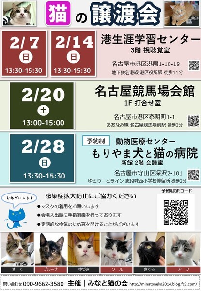 | イベント内容 | =みなと猫の会 第266回譲渡会のお知らせ== 新しい家族を待つ猫たちに 会いに来ませんか? ◆ペットショップへ行く前にぜひ譲渡会へ◆ トイレトレーニングや 基本的な健康診断を終わらせた 猫たちが大集合! ○主 催 みなと猫の会 ○日 時 2021年2月7日(日) 13:30~15:30 ○場 所 港生涯学習センター 3階 視聴覚室 愛知県名古屋市港区港陽町1丁目10-18 地下鉄名港線「港区役所」駅徒歩11分 ※建物裏に専用駐車場有(利用料:終日300円) https://goo.gl/maps/sLfav8emZ5p ※お問い合わせは会場ではなく minatonekonokai@gmail.comもしくは 090-9662-3580 まで ○参加猫について ・参加している猫は、ワクチンや駆虫等の基本治療を済ませています。 また、年齢に応じて避妊去勢手術を行っています。 ・参加予定猫が体調不良などで急遽不参加になることもあります。 ○ご来場の皆様へ ・譲渡会の見学は入場無料・予約不要です。 ・当日に猫をお渡しすることはありません。 後日ご自宅までお届けに伺います。 ・一週間から二週間のトライアル期間後、正式譲渡となります。 ・トライアル及び譲渡の際には 完全室内飼い・ご家族の同意・脱走防止策・ アンケート記入など諸条件がございます。 ・里親様には治療費の一部ご負担をお願いしております。 これ以上不幸な猫を増やさないための 治療費とさせて頂きますので何卒ご理解ください。 ・非会員の個人保護者も参加しています。 譲渡条件やトライアルは猫の保護者に準じます。 ・譲渡会の流れ http://minatoneko2014.blog.fc2.com/blog-entry-11.html ○参加猫情報は随時更新中! ↓↓参加猫一覧↓↓ http://minatoneko2014.blog.fc2.com/blog-entry-493.html ○猫に関する相談も受け付けています ねこについての困りごと、トラブルなどを抱えている方、 相談へいらっしゃいませんか。 ○次回以降の譲渡会予定 日時:2021年2月14日(日)13:30-15:30 場所:港生涯学習センター 3階 視聴覚室 名古屋市港区港陽1丁目10-18 地下鉄名港線「港区役所」駅より徒歩9分 日時:2021年2月20日 (土) 13:00-15:00 場所:名古屋競馬場会館 1F 打合せ室 名古屋市港区泰明町1-1 あおなみ線「名古屋競馬場前」駅より徒歩3分 日時:2021年2月28日(日) 13:30-15:30 場所:動物医療センター もりやま犬と猫の病院 新館2階 会議室 愛知県名古屋市守山区深沢2-101 ゆとりーとライン「志段味西小学校」バス停留所 徒歩2分 ※来場予約制 日時:2021年3月7日(日)13:30-15:30 場所:港生涯学習センター 3階 視聴覚室 名古屋市港区港陽1丁目10-18 地下鉄名港線「港区役所」駅より徒歩9分 日時:2021年3月14日(日)13:30-15:30 場所:港生涯学習センター 3階 視聴覚室 名古屋市港区港陽1丁目10-18 地下鉄名港線「港区役所」駅より徒歩9分 ◎主催者ブログ みなと猫の会 ~こぴっと猫だより~ http://minatoneko2014.blog.fc2.com/ ◎参加者のブログ myままさんブログ「にゃんこの宝箱」 http://wagayamama.cocolog-nifty.com/jiru/ 犬白ママさんブログ「犬白日記」 http://k531.blog25.fc2.com/ uzumakinecoさんブログ「猫ときどき雨」 http://uzumakineco.blogspot.jp/ sion1226さんブログ「さとおやさがし」 http://sion1226.blog.fc2.com/blog-entry-1.html ■上記ブログに会ってみたい猫がいた!でも参加予定猫に入ってない、 どうすればいいの? ■譲渡会当日は都合が悪くて… それ以外の日に猫とお見合いがしたい! などのお問い合わせは minatonekonokai@gmail.com まで 〇感染症の拡大防止にご協力願います ※会場入出時の手の消毒にご協力ください ※定期的に換気作業を行います ※マスク等の装着を推奨しております 写真2枚目 うっちー ♀ 1~2才 ムクムクの黒猫女子 好奇心旺盛で素直な性格です たまにシャイガール 写真3枚目 ぽにょ ♀ 13才 ふくよかボディとツヤツヤ毛並みの美魔女猫 お気に入りの場所でのんびり過ごすのが好きです ☆★個性豊かな猫たちが皆様をお迎えします★☆ 猫とスタッフ一同、お待ちしております |