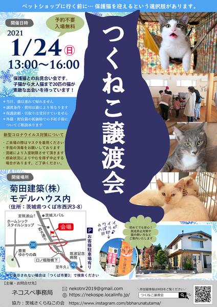| イベント内容 | 個人で保護している猫たちの保護猫譲渡会です。 子猫から大人猫まで、約20匹の猫が参加予定です。 モデルハウスの1階と2階を使って余裕ある展示をしているので、 来場者さんからは、じっくりお話しができ、ゆっくり見て回れると好評です。 猫をはじめて迎える方、今はまだ迎えられないけど保護猫を考えているという方もお気軽にお声がけください。 準備するものや、ライフスタイルに合ったマッチングをご提案いたします。 参加する猫は個人宅で保護している猫たちです。 医療をかけ、家猫修行をさせ、ピカピカにして新しいお家へと巣立たせます。 大切な「命」ですので、猫を譲渡するにあたり、 一定のお願いやお約束、医療費の一部をご負担いただくことをご了承ください。 ペットショップのほかに、保護猫を迎えるという選択肢を加えてください。 身寄りのない猫たちが、ずっとの家族との出逢いを待っています。 ※参加猫はネコスペ事務局ホームページで公開しています。 *** 「つくねこ譲渡会」 ・日時:1月24日(日)13:00~16:00 ・場所:菊田建築モデルハウス(いつくば市西沢3-8) ・予約不要・入場無料 ・駐車場あり ・参加猫紹介 https://nekospe.localinfo.jp/pages/3110908/page_201908041108 ◉ネコスペ事務局 ネコスペ事務局は、個人で活動するボランティアさんの後方支援部隊です。 保護猫・保護犬の譲渡会やイベントを企画・運営しています。 https://nekospe.localinfo.jp |