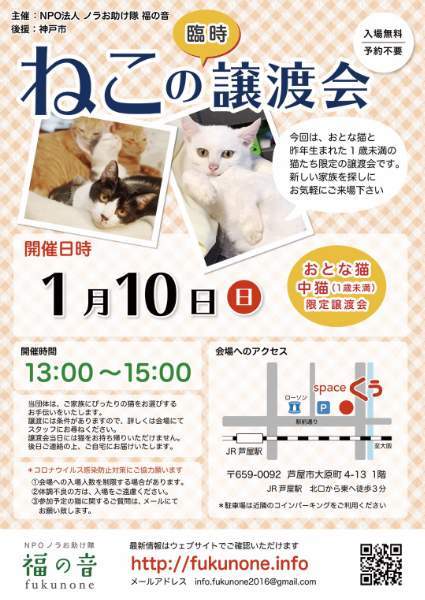 | イベント内容 | 大人の猫たちが新しいお家を探しに参加をします。 ペット不可にお住まいの方はご遠慮ください。 当日猫の持ち帰りは出来ませんのでご了承ください。 後日猫はこちらからお届けさせて頂きます。 事前の予約を伺っていますので、ご予約をしてからお越しください。 お越しの際はJR芦屋駅からは徒歩3分、車でお越しの場合は近隣にコインパーキングがあります。 当日、体調の悪い方、発熱がある方、このような方はご遠慮ください。 こちらでは、体温チェックや消毒をさせて貰っています。 お問い合わせは、ノラお助け隊福の音 で! htt://fukunone.info |