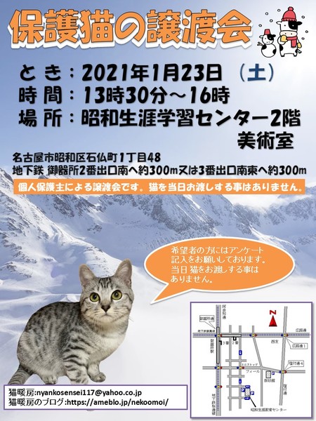 | イベント内容 | 保護猫の譲渡会! 名古屋市昭和区 昭和生涯学習センター2階 美術室にて開催します。 子猫から 少し育った若猫、性格が安定した大人猫が ずっとのおうちを探しています。 個人保護主が集まって共同開催しております。 譲渡条件などは 個々の保護主よりますので 気になる猫さんがいましたら お気軽に保護主にお尋ね下さい。 (^-^) ご来場の際 マスクの着用をお願い致します。 マスクはご来場者様でご用意下さい。 希望者の方には アンケート記入をお願いしております。 アンケートを元に お話しをさせて頂きます。 当日 猫を連れて帰る事は出来ません。 お車でお越しの場合 施設駐車場 もしくは 近隣のコインパーキング(有料)をご利用下さい。 路上駐車は 近隣住民のご迷惑になりますのでおやめください。 譲渡会会場はお借りしているだけですので 会場へのお問合せはご遠慮下さい。 最寄駅 地下鉄 御器所駅 |