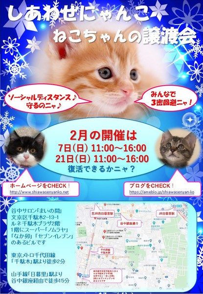 | イベント内容 | 「しあわせにゃんこ」は行き場のない猫ちゃんと里親様との出会いの場を提供するグループです♪ 子猫も成猫もハンデのある猫もみんな新しい家族を待っています♪ みなさまのご来場を保護主、スタッフ一同心よりお待ちしております♪ 感染者数減少のまま推移してくれれば開催します! なにげ2021年初開催になります♪ 寒い冬こそあったかにゃんこが必須ですよ(笑) まだまだご縁を待ってるにゃんこ達が沢山います♪ 開催にあたりソーシャルディスタンスを守る為、各種制限等を設けております。 ※詳しくはホームページ譲渡会情報をご確認願います。 http://www.shiawasenyanko.net/jyoutokai.html 猫好きの聖地「谷根千」にて皆様のご来場をお待ちしております♪ ◆開催日/開催時間◆ 2021年2月21日(日) 11:00~16:00 ご希望の猫ちゃんがいらっしゃる場合は11時30分までに受付をお願い致します。 複数のお申し込みがある場合は11時30分で受付を終了させて頂く場合がございます。 受付をされた全ての里親様とお見合いをさせて頂きます。 ※先着順ではございません。 ※当日、猫ちゃんを連れて帰ることは出来ません。 後日調整のうえ保護主が里親様宅へお届けいたします。 ◆会場◆ 東京都文京区千駄木2-13-1 ルネ千駄木プラザ2階 谷中サロン「まいの間」 ※詳しいアクセスはホームページ案内図をご覧下さい http://www.shiawasenyanko.net/mapmainoma.pdf 谷中サロン「まいの間」の情報はこちら http://neko-to-kyo.com/#maima ◆交通手段◆ 東京メトロ千代田線「千駄木」駅より徒歩2分 JR山手線「西日暮里」駅より徒歩12分 JR山手線「日暮里」駅より谷中銀座経由で徒歩15分 ※お車でご来場の際、駐車場のご用意はございません。 近隣のコインパーキング等をご利用ください。※近隣に沢山あります。 いつ里の掲載参加猫一覧はこちらから https://satoya-boshu.net/mypage/foster_list.php?@ps@=none アメーバブログの里親募集にゃんこはこちら https://ameblo.jp/shiawasenyan-ko/theme-10092719565.html ◆猫ちゃんとのお見合い◆ 掲載している猫ちゃんは基本的に譲渡会場でのお見合いのみとなります。 譲渡会への参加が決定している猫ちゃんはその譲渡会で里親様が決定しなかった場合のみ保護主宅でのお見合いが可能となります。 自宅お見合いを希望される里親様はメール(info@shiawasenyanko.net)にてご相談ください。 ◆当譲渡会では猫ちゃんと里親様のスキンシップを大切にしています◆ 新しい家族として20年以上いっしょに暮らしていく猫ちゃんです。 譲渡会場でたくさんの猫ちゃんと触れ合って良きパートナーを見つけてください。 はじめて猫ちゃんを迎える不安や先住猫ちゃんとのトライアルの注意点、猫ちゃんと里親様の暮らし方など気軽にご相談ください。 経験豊富な保護主や猫大好きスタッフがアドバイスさせていただきます。 ◆子猫ご希望の里親様◆ 子猫は急な下痢や発熱等により体調が急変し、数時間対応ができなかっただけでも命を落とす事があります。 その為、当譲渡会では月齢によりお留守番のない又は少ないご家庭への譲渡に限らせて頂いております。 また里親様と子猫ちゃんが安心してトライアル期間を過ごせるよう体重が1㎏程になってからのお届けとさせて頂いております。 ◆里親希望のみなさまへ◆ ご家族の皆様で生涯、家族の一員としてたっぷり愛情を注いでくださるご家庭をお待ちしております。 下記に該当する希望者様へ ・独身、単身者の方 ・友人同士、同棲でのお住まいの方 ・高齢者のみのご家庭の方 は、ご相談の上、譲渡を判断させて頂きます ・適正飼育の不可能な方 ・脱走防止対策にご協力頂けない方 ・定期報告の不可能な方 は、ご遠慮下さいますようお願い致します ◆ご負担頂く費用について◆ 譲渡の際に譲渡負担金(医療費の一部、譲渡金、お届け時の交通費)を里親様にご負担頂く事により 過酷な状況にいる猫ちゃんを保護し新しいご家族の元へ送り出す事ができています。 皆様のご理解とご協力にボランティア一同、心より感謝しております。 ご負担頂く医療費につきましてはホームページに詳しく記載させて頂いております。 http://www.shiawasenyanko.net/onegai.html しあわせにゃんこホームページ http://www.shiawasenyanko.net メールでのお問い合わせ info@shiawasenyanko.net |