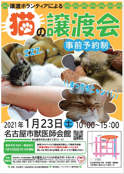 | イベント内容 | 名古屋市動物愛護センターの譲渡ボランティアによる猫の譲渡会です。 新型コロナウイルス感染症対策として事前予約制です。 ご来場の際はマスクの着用をお願いいたします。 詳しくは「名古屋市人とペットの共生サポートセンタ-」のWEBまたは電話、QRコードでご確認ください。 TEL 052-681-2211 サクラねこ名古屋は 13:00~15:00に参加予定です。 |