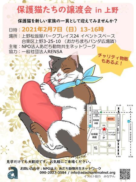 | イベント内容 | 保護猫たちの譲渡会in上野 日時:令和3年2月7日(日) 午後1時~4時 場所:台東区上野3-32-10 上野松坂屋パークプレイス24 1Fイベントスペース (おかちまちパンダ広場隣) 内容:飼い主のいない猫の譲渡会 チャリティー物販 主催:NPO法人あだち動物共生ネットワーク ------------------------------------------------------------ 定期開催をしている、竹ノ塚里親の会(@西新井)・北千住譲渡会・猫の里親をさがす会(@亀有)の3団体に参加している猫たちがやってきます。 保護された猫たちの新しい飼い主になってくださる方、是非ご来場ください。 【譲渡条件(概要)】 ●終生飼育 ●完全室内飼育 ●不妊去勢手術による繁殖制限措置の実施 ●人と猫のQOL、近隣に配慮した適正飼育 ●ペット可住宅にお住まいであること ●同居ご家族全員の同意 ●獣医療費・保育費の一部ご負担あり 譲渡費用 成猫20.000円 仔猫15.000円 ※参加する猫は、一般家庭(保護主さん宅)にて普通の家庭の猫同様のケアを受けながら暮らしている猫たちです。 ノミダニ駆除、ワクチン接種、検便、ウィルスチェック、不妊去勢手術など、適宜最低限の処置を行いながら保護主さんたちが自前で保護預かりを行っています。里親さんにもそうした費用を一部ご負担いただくことで保護や譲渡活動は成立しますので、ご理解ご協力を宜しくお願いいたします。 【ご注意】 ●その猫の年齢・性格などを考慮して、適した飼育が可能な方に譲渡いたします。 ●当日、猫を連れ帰ることはできません。お話がまとまったら、後日こちらからご自宅までお届けいたします。(譲渡会当日はキャリーバッグなどは不要です。) ●譲渡の際は、身分証明書の確認・契約書への署名捺印があります。 ●ご希望される方の状況によっては、お断りする場合もあります。 主催:NPO法人あだち動物共生ネットワーク https://twitter.com/NPO62898321 https://www.adachianimalnet.org/ 協力:一般社団法人RENSA http://www.rensa.or.jp/ |