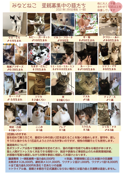 | イベント内容 | 東京都内を中心に年間180匹の譲渡を行なっている、みなとねこが田町駅芝浦口で譲渡会を開催します。 できれば預かり宅で普段の元気いっぱいな姿をみていただきたい。けれど、ご希望の方全員にお越しいただくのは難しい。 里親希望の方にしても一度見てから考えたい、わざわざお見合いに行ってしまうと断りづらいんじゃないかというお気持ちもあると思います。 そこで毎月譲渡会を行なってきました。 2020年7月からは地元港区内の開放的な素敵なレンタルスペースで開催しています。 緊急事態宣言下ではありますが、今回は少し規模を縮小して子猫と大人猫合わせて10ケージ くらい参加します。 みなとねこは今後もまだまだたくさんの猫の保護の予定があります。また猫をお迎えいただくにはそれなりにご準備も必要ですので、今すぐは難しい方にもご希望の猫の条件をお伺いして、該当の猫が出てきたらご紹介という形で今まで以上にスピーディーでかつミスマッチのない譲渡を目指します。 ただ子猫は圧倒的に春に生まれ秋や冬にはあまり生まれません。6月くらいになると今年の子猫が多く保護されると思います。 またみなとねこは子猫は2匹ペアでの譲渡が原則です。 初めての方こそ最初から2匹をお勧めしています。 また私たちボランティアはご縁のあった猫たちに終生里親様に愛されて幸せに安全に暮らして欲しいと願っています。 このため里親になっていただくにはいくつかの条件やお約束事があります。 ■里親申込 事前誓約書 adobe.ly/35jdcb2 会場では申込書とお部屋のお写真を拝見してお迎えまでにご準備いただきたいことなどご説明します。 ■里親申込書 adobe.ly/2HqP1iI 会場にてご記入いただくことも可能ですが、お手元で印刷可能でしたら、ご記入の上ご来場いただくことをおすすめしております。 ※事前誓約書の3と4に該当がある方は是非事前にご相談ください。 また猫それぞれの月齢や保護主の考えにより、譲渡条件が加わる場合があります。 また新型コロナの感染拡大防止の観点から予約優先、混雑時は入場をお待ちいただいたり、時間制限、人数制限を行います。 マスクの着用と消毒のご協力をお願いしております。換気のためにドアをオープンしての開催のためにケージ越しでのご対面となりますことご理解ください。 実際の参加予定猫は2/6(土)20:00までにFacebookページでご紹介します。 https://m.facebook.com/minatoneco/ |