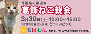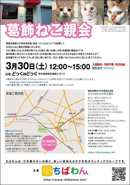 | イベント内容 | 葛飾区鎌倉にある犬同伴美容室・喫茶「どっくwどっぐ」にて、ちばわんねこ親会(保護猫の譲渡会)を開催いたします。 可愛い保護猫たちに会いに来てくださいね♪ 見学は予約不要です。 保護猫のお迎えを検討されている方だけでなく、今は飼えないけど猫の飼育に興味のある方、ボランティア活動に興味のある方、ただただ猫が大好きな方なども大歓迎ですので、お気軽に会場へ足をお運び下さい!! 参加猫情報については、ちばわんHPをご覧ください。 http://chibawan.net/event/20190330-katsushika-cat なお、千葉県市川市、神奈川県横浜市、東京都港区赤坂でもねこ親会を開催中です。詳しい日程などはちばわんHPのイベント情報にてご確認下さい。 http://chibawan.net/eventcat/eventall ◆◆◆◆◆◆◆◆◆◆◆◆◆◆◆◆ 日時 3月30日(土)12:00-15:00 場所 125-0053 東京都葛飾区鎌倉3-16-13 「どっくwどっぐ」店舗内 室内開催 雨天決行(荒天中止) ◆◆◆◆◆◆◆◆◆◆◆◆◆◆◆◆ 【会場内でのお願い】 ・当日、会場内への犬猫等の愛玩動物の同伴は出来ません。 ・譲渡が決定した場合、後日猫をご自宅へお届けいたします。当日猫をお引渡しすることはございません。 【アクセス】 ・北総線「新柴又駅」より徒歩約5分 ※会場に駐車場はありません。車でお越しの場合は、付近のコインパーキングをご利用ください。 電車・バスなどの公共の交通機関の利用をお勧めいたします。 【当日の流れ】 (1)家族募集中のねことお会いになりたい方はどなたでも自由にご参加いただくことができます。ちばわんボランティアは名札をつけておりますので、お声をかけて下さい。 預かりボランティアが控えておりますのでねこの性格や生活習慣など、遠慮なくご質問ください。 (2)ご希望の子が決まったら、お申し込みアンケートにご記入の上、ボランティアにお渡し下さい。 (前日までにメールでアンケートを送信してお申し込みいただくこともできます。) ◆「ねこ」アンケート送信先:(以下URLをクリックするとフォームが開きます) http://chibawan.net/contactform_cat (3)アンケート内容を拝見し、お話させていただきます。 (4)原則として一両日中にお返事の連絡をさせていただきます。 (5)ご縁が成立した場合には、後日、こちらからご自宅まで猫をお届けし、約1ヶ月のお試し生活に入っていただきます。お届けの際に、書面での譲渡契約書を交わします。 ※ワクチン・不妊手術代など保護にかかった費用は、家族になる方にもご負担をお願いしています ◆ねこ親会について:(以下URLをクリックするとフォームが開きます) http://chibawan.net/inquiry_cat ※イベント当日はメールを見ることが出来ません。また、お問い合わせの際は、必ず「具体的な件名」を入れて多数の迷惑メールと区別がつくようにお願いいたします。 ※業務に支障がでる恐れがありますので本イベントに関する「どっくwどっぐ」様へのお問い合わせはご遠慮ください。 |