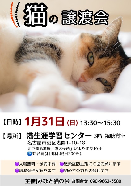 | イベント内容 | =みなと猫の会 臨時譲渡会のお知らせ== 新しい家族を待つ猫たちに 会いに来ませんか? ◆ペットショップへ行く前にぜひ譲渡会へ◆ トイレトレーニングや 基本的な健康診断を終わらせた 猫たちが大集合! ○主 催 みなと猫の会 ○日 時 2021年1月31日(日) 13:30~15:30 ○場 所 港生涯学習センター 3階 視聴覚室 愛知県名古屋市港区港陽町1丁目10-18 地下鉄名港線「港区役所」駅徒歩11分 ※建物裏に専用駐車場有(利用料:終日300円) https://goo.gl/maps/sLfav8emZ5p ※お問い合わせは会場ではなく minatonekonokai@gmail.comもしくは 090-9662-3580 まで ○参加猫について ・参加している猫は、ワクチンや駆虫等の基本治療を済ませています。 また、年齢に応じて避妊去勢手術を行っています。 ・参加予定猫が体調不良などで急遽不参加になることもあります。 ○ご来場の皆様へ ・譲渡会の見学は入場無料・予約不要です。 ・当日に猫をお渡しすることはありません。 後日ご自宅までお届けに伺います。 ・一週間から二週間のトライアル期間後、正式譲渡となります。 ・トライアル及び譲渡の際には 完全室内飼い・ご家族の同意・脱走防止策・ アンケート記入など諸条件がございます。 ・里親様には治療費の一部ご負担をお願いしております。 これ以上不幸な猫を増やさないための 治療費とさせて頂きますので何卒ご理解ください。 ・非会員の個人保護者も参加しています。 譲渡条件やトライアルは猫の保護者に準じます。 ・譲渡会の流れ http://minatoneko2014.blog.fc2.com/blog-entry-11.html ○参加猫情報は随時更新中! ↓↓参加猫一覧↓↓ http://minatoneko2014.blog.fc2.com/blog-entry-493.html ○猫に関する相談も受け付けています ねこについての困りごと、トラブルなどを抱えている方、 相談へいらっしゃいませんか。 ○次回以降の譲渡会予定 日時:2021年2月7日(日)13:30-15:30 場所:港生涯学習センター 3階 視聴覚室 名古屋市港区港陽1丁目10-18 地下鉄名港線「港区役所」駅より徒歩9分 日時:2021年2月14日(日)13:30-15:30 場所:港生涯学習センター 3階 視聴覚室 名古屋市港区港陽1丁目10-18 地下鉄名港線「港区役所」駅より徒歩9分 ◎主催者ブログ みなと猫の会 ~こぴっと猫だより~ http://minatoneko2014.blog.fc2.com/ ◎参加者のブログ myままさんブログ「にゃんこの宝箱」 http://wagayamama.cocolog-nifty.com/jiru/ 犬白ママさんブログ「犬白日記」 http://k531.blog25.fc2.com/ uzumakinecoさんブログ「猫ときどき雨」 http://uzumakineco.blogspot.jp/ sion1226さんブログ「さとおやさがし」 http://sion1226.blog.fc2.com/blog-entry-1.html ■上記ブログに会ってみたい猫がいた!でも参加予定猫に入ってない、 どうすればいいの? ■譲渡会当日は都合が悪くて… それ以外の日に猫とお見合いがしたい! などのお問い合わせは minatonekonokai@gmail.com まで 〇感染症の拡大防止にご協力願います ※会場入出時の手の消毒にご協力ください ※定期的に換気作業を行います ※マスク等の装着を推奨しております 写真2枚目 すみれ ♀ 6ヶ月 人が好き!ネコも好き! 美味しいおやつはもっと好き! 甘えん坊のスリゴロさん 写真3枚目 ソル ♂ 3才 ちょっぴり長毛なフワモコ男子 先天的に瞼がなかったため 手術をして形成しました マイペースなのほほんさんです ☆★個性豊かな猫たちが皆様をお迎えします★☆ 猫とスタッフ一同、お待ちしております |