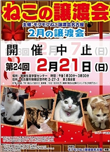| イベント内容 | 申し訳ございませんが、諸事情により2月7日譲渡会は開催を見合わせることとなりました。 次回2月21日は予定通り開催予定です。ぜひ、2月21日にご来場ください。 ------------------------------------------------------------------ モフモフねこ譲渡会名古屋 猫たちの幸せなお家探しのために譲渡会を開催しております。 個人ボランティアの集まりです。 自分たちの出来ることから頑張っております! 一匹でも幸せになれる猫が増えますように 場所 瑞穂生涯学習センター 第3集会室 住所 名古屋市瑞穂区惣作町2-27-3 時間 13時30分~15時30分 交通機関等 地下鉄「妙音通」下車1番出口より徒歩8分 駐車場19台(満車の場合は近隣コインPをご利用ください) 参加猫の情報は下記モフモフねこ譲渡会名古屋ブログにてご確認ください。 https://mofumofuneko4.fc2.net/ 新型コロナウイルス対策として ・会場は換気を定期的に行います。 ・密を避けるため、入場制限をさせていただきます。 ・入口にて手指の消毒、検温をお願いいたします。 ・ご来場の際はマスク着用をお願いいたします。 ・咳・発熱・倦怠感等の体調のすぐれない方はご来場を控えていただきますよう、お願いいたします。 ・新型コロナウイルスの影響により急遽中止になる場合もありますので、モフモフねこ譲渡会名古屋ブログにてご確認の上、ご来場ください。 【譲渡会について】 ・譲渡会は入場無料、予約不要です。お気軽にご参加ください。 ・会場へのお問い合わせはご遠慮ください。 ご質問は下記メールアドレスへお願いいたします。 mofumofuneko4☆gmail.com ☆を@に変更してお問い合わせください。 ・猫の引き取りはしておりません。 ・譲渡会当日に猫をお渡しすることはありません。 ・保護主によって譲渡条件が違う場合があります。 ・参加予定でも譲渡会前にトライアルになる場合があります。 ご希望の猫がいましたらまずはお問い合わせをお願いいたします。 【参加猫について】 ・ノミ駆除、駆虫、トイレ躾、ワクチン3種接種済。 ・年齢や健康状態に応じて、避妊手術を行っております。 ・参加予定で紹介していても当日体調不良等で欠席になる場合があります。 【譲渡の約束事】 ・ペット飼育可の住宅にお住まいの方。 ・完全室内飼育。 ・脱走防止の対策をしていただける方。 ・避妊手術未実施の場合、避妊手術 の実施と報告をしていただける方。 ・ご家族全員が猫を飼うことに同意していること。 ・譲渡後、しばらく定期連絡を入れていただける方。 *お一人暮らしの方、60歳以上の方は、身内の方の保証が必要となる場合がございます。 #名古屋瑞穂区 #瑞穂生涯学習センター #譲渡会 #保護猫 #地域猫 #さくらねこ #tnr #里親募集 #里親募集中 #猫 #ねこ #殺処分ゼロ #買わずに飼おう #モフモフねこ譲渡会名古屋 #ペットショップに行く前に #譲渡会のお知らせ #猫と暮らしたい ---------------------------------------------------------------------- <iframe src="https://www.google.com/maps/embed?pb=!1m18!1m12!1m3!1d3263.466020038896!2d136.9235393154698!3d35.1200423681507!2m3!1f0!2f0!3f0!3m2!1i1024!2i768!4f13.1!3m3!1m2!1s0x60037a463d09cd79%3A0x526a1e64b5c55909!2z55Ge56mC55Sf5rav5a2m57-S44K744Oz44K_44O8!5e0!3m2!1sja!2sjp!4v1600911646771!5m2!1sja!2sjp" width="600" height="450" frameborder="0" style="border:0;" allowfullscreen="" aria-hidden="false" tabindex="0"></iframe> ---------------------------------------------------------------------- |