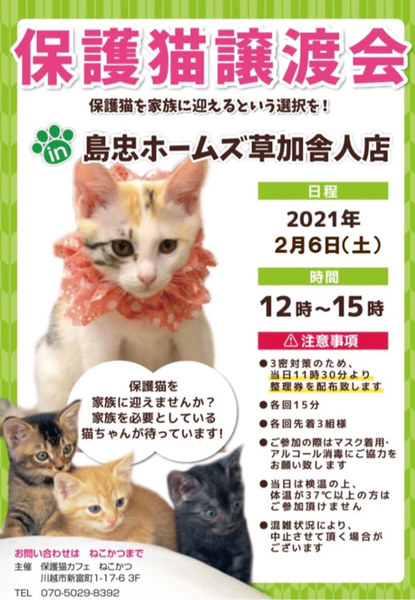 | イベント内容 | 2月6日(土)保護猫カフェ「ねこかつ」さん主催の譲渡会が開催されます。子猫から中猫から成猫迄沢山の猫達が参加予定です。 新型コロナウィルス感染拡大防止のための「注意事項」があります。 日時 2/6(土)12:00〜15:00 会場 島忠ホームズ草加舎人店店(草加市遊馬町 2-1) ■最寄駅からの交通アクセス *日暮里・舎人ライナー「見沼代親水公園駅」より徒歩約10分 *東武伊勢崎線「草加駅」より東武バス(草加22系統)乗車 「島忠ホームズ」より徒歩すぐ ■車の場合 *ナビシステムによっては「41-1」で検索をすると正確 ■駐車場のご案内 *大型無料駐車場完備 主催 保護猫カフェねこかつ 子猫から中猫から成猫さんまでいろいろな世代の子達が沢山参加予定です。 ぜひ足をお運び下さい。 譲渡にはお願いごとがございます。譲渡条件をご確認下さい。 浦和キャッツ「http://urawacats.blog133.fc2.com/」をご覧下さい。 参加猫達は 浦和キャッツ http://urawacats.blog133.fc2.com/ または 翔べ!しっぽの猫たち https://ameblo.jp/shippocats-ganba2016/ をご覧下さい。 不幸な犬や猫が沢山います。 浦和キャッツは猫の保護活動をしていますが助けられる猫はほんの少し。 なんとか保護出来た子はみんな幸せへと送り出したいと強く思い活動しています。 猫と暮らしたいと思われましたらぜひ保護猫を家族に迎えて頂けます様に。 尚、天候などにより里親会が開催されない場合があります。 当日朝のブログにてお知らせしますので、予めご確認お願いします。 |