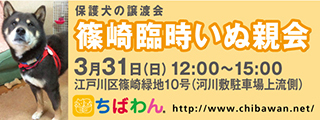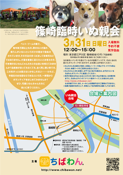 | イベント内容 | 篠崎会場は毎月第3日曜日に 「定例いぬ親会」を開催しておりますが、 3月31日(日)に臨時でいぬ親会を開催いたします。 本当の家族を待っている 個性豊かな可愛い保護犬達が参加予定です♪ 「保護犬を家族として迎えたい」、 「今すぐには無理だけどいつか一緒に楽しい生活を送りたい」 とお考えの皆様、イベントWebサイトをお読みいただき、 ぜひ足をお運びください。 http://chibawan.net/event/20190331-shinozaki-dog 入場・駐車場無料、見学も自由です。 たくさんの方のお越しをお待ちしています! 犬猫ボランティアに興味がある方も募集中です。 ☆開催場所:江戸川河川敷 篠崎緑地10号そば(河川敷駐車場そば) (住所:東京都江戸川区上篠崎1丁目) ☆開催時間:12:00~15:00 ☆入場料・参加費:入場無料 ※譲渡の際には、保護中にかかった医療費の一部のご負担をお願いしております。 ☆ペット同伴入場:同伴可 ※会場内には多くの犬がいますので、必ずリードの着用をお願いいたします。 伸縮リードのご使用はトラブル防止のためご遠慮願います。 ☆原則として室内飼育をお願いしております。 ☆駐車スペースは、川沿いの土地面のみとなります。 アスファルトの舗装道路は緊急車両用のため、駐車はご遠慮願います。 ☆強い雨の場合は中止いたします。微妙なお天気 または 中止の場合は、 朝8時までに上記イベントWebサイトURLページにてお知らせしますので、 ご確認をお願いいたします ※参加犬は後日「参加予定の子たち」に掲載いたします。 バナー、ポスターの写真の犬が必ず参加するとは限りません。 ご了承願います。 詳しくはイベントホームページをご参照ください。 臨時いぬ親会イベントホームページ http://chibawan.net/event/20190331-shinozaki-dog ちばわんホームページ http://chibawan.net/ |