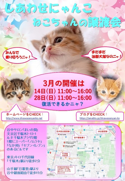 | イベント内容 | 「しあわせにゃんこ」は行き場のない猫ちゃんと里親様との出会いの場を提供するグループです♪ 子猫も成猫もハンデのある猫もみんな新しい家族を待っています♪ みなさまのご来場を保護主、スタッフ一同心よりお待ちしております♪ 感染者数減少を条件に開催の予定です! 寒い冬こそあったかにゃんこが必須ですよ(笑) まだまだご縁を待ってるにゃんこ達が沢山います♪ 開催にあたりソーシャルディスタンスを守る為、各種制限等を設けております。 ※詳しくはホームページ譲渡会情報をご確認願います。 http://www.shiawasenyanko.net/jyoutokai.html 猫好きの聖地「谷根千」にて皆様のご来場をお待ちしております♪ ◆開催日/開催時間◆ 2021年3月14日(日) 11:00~16:00 ご希望の猫ちゃんがいらっしゃる場合は11時30分までに受付をお願い致します。 複数のお申し込みがある場合は11時30分で受付を終了させて頂く場合がございます。 受付をされた全ての里親様とお見合いをさせて頂きます。 ※先着順ではございません。 ※当日、猫ちゃんを連れて帰ることは出来ません。 後日調整のうえ保護主が里親様宅へお届けいたします。 ◆会場◆ 東京都文京区千駄木2-13-1 ルネ千駄木プラザ2階 谷中サロン「まいの間」 ※詳しいアクセスはホームページ案内図をご覧下さい http://www.shiawasenyanko.net/mapmainoma.pdf 谷中サロン「まいの間」の情報はこちら http://neko-to-kyo.com/#maima ◆交通手段◆ 東京メトロ千代田線「千駄木」駅より徒歩2分 JR山手線「西日暮里」駅より徒歩12分 JR山手線「日暮里」駅より谷中銀座経由で徒歩15分 ※お車でご来場の際、駐車場のご用意はございません。 近隣のコインパーキング等をご利用ください。※近隣に沢山あります。 いつ里の掲載参加猫一覧はこちらから https://satoya-boshu.net/mypage/foster_list.php?@ps@=none アメーバブログの里親募集にゃんこはこちら https://ameblo.jp/shiawasenyan-ko/theme-10092719565.html ◆猫ちゃんとのお見合い◆ 掲載している猫ちゃんは基本的に譲渡会場でのお見合いのみとなります。 譲渡会への参加が決定している猫ちゃんはその譲渡会で里親様が決定しなかった場合のみ保護主宅でのお見合いが可能となります。 自宅お見合いを希望される里親様はメール(info@shiawasenyanko.net)にてご相談ください。 ◆当譲渡会では猫ちゃんと里親様のスキンシップを大切にしています◆ 新しい家族として20年以上いっしょに暮らしていく猫ちゃんです。 譲渡会場でたくさんの猫ちゃんと触れ合って良きパートナーを見つけてください。 はじめて猫ちゃんを迎える不安や先住猫ちゃんとのトライアルの注意点、猫ちゃんと里親様の暮らし方など気軽にご相談ください。 経験豊富な保護主や猫大好きスタッフがアドバイスさせていただきます。 ◆子猫ご希望の里親様◆ 子猫は急な下痢や発熱等により体調が急変し、数時間対応ができなかっただけでも命を落とす事があります。 その為、当譲渡会では月齢によりお留守番のない又は少ないご家庭への譲渡に限らせて頂いております。 また里親様と子猫ちゃんが安心してトライアル期間を過ごせるよう体重が1㎏程になってからのお届けとさせて頂いております。 ◆里親希望のみなさまへ◆ ご家族の皆様で生涯、家族の一員としてたっぷり愛情を注いでくださるご家庭をお待ちしております。 下記に該当する希望者様へ ・独身、単身者の方 ・友人同士、同棲でのお住まいの方 ・高齢者のみのご家庭の方 は、ご相談の上、譲渡を判断させて頂きます ・適正飼育の不可能な方 ・脱走防止対策にご協力頂けない方 ・定期報告の不可能な方 は、ご遠慮下さいますようお願い致します ◆ご負担頂く費用について◆ 譲渡の際に譲渡負担金(医療費の一部、譲渡金、お届け時の交通費)を里親様にご負担頂く事により 過酷な状況にいる猫ちゃんを保護し新しいご家族の元へ送り出す事ができています。 皆様のご理解とご協力にボランティア一同、心より感謝しております。 ご負担頂く医療費につきましてはホームページに詳しく記載させて頂いております。 http://www.shiawasenyanko.net/onegai.html しあわせにゃんこホームページ http://www.shiawasenyanko.net メールでのお問い合わせ info@shiawasenyanko.net |