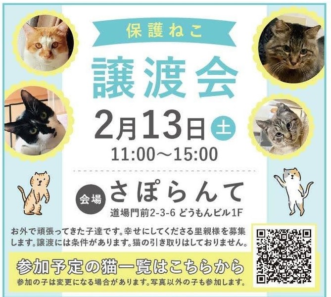 | イベント内容 | お外で頑張ってきた保護猫ちゃんが待ってます。 2月13日(土)に山口市の『さぽらんて』で「保護ねこ譲渡会inさぽらんて」(ボランティア合同開催)が開催されます。 時間は11時から15時まで。 子猫達は写真で見るより実際に見てもらった方が可愛いと思います。ぜひ足をお運びいただいて、運命の子との出会いを見つけてください。 *譲渡には条件がありますので、気になる子がいましたらお問い合わせください。 *参加予定ねこちゃんは当日変更になる場合があります。 *チャリティーバザーもあります。 *感染症予防対策は会場でも行っておりますが、各自でも宜しくお願い致します。 *1枚目画像はホップさん作成のものを使用させて頂いております。 |