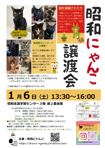 | イベント内容 | 飼い主のいない猫の里親探しのお手伝いをしています。 一歩踏み出すことで繋がる命があります。 ずっとのお家を探している猫たちに手をさしのべていただけませんか? 昭和にゃんこでは譲渡会でのお見合いがメインとなります。 会場:昭和生涯学習センター 地下鉄 鶴舞線「御器所」2番出口南約300m 桜通線「御器所」3番出口東約300m 市バス 金山26号系統、昭和巡回系統「恵方町」東約100m 駐車場有 有料300円 主催 昭和にゃんこ HP https://showa-nyanko.jimdofree.com/ 終生飼育、完全室内飼育、不妊去勢手術するなどのお約束事があります。 詳しくは当日丁寧にご説明いたします。 譲渡には譲渡契約書への署名、基本検査費などの費用の一部負担をお願いしています。 当日の譲渡は行いません。後日、ご自宅までお届けし1週間ほどのトライアルをしていただきます。 |