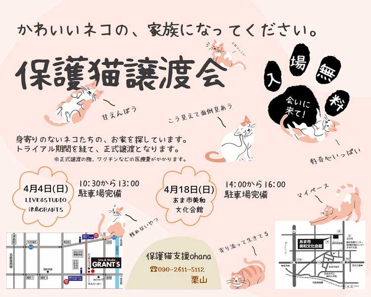 | イベント内容 | 開催場所 愛知県津島市 ライブスタジオGRANTS(モスバーガー津島店の裏)にて、保護ねこの、譲渡会を開催します。 駐車場あり。 建物のすぐ横の砂利の駐車場になります。 コロナ対策万全でお待ちしております。 トライアル希望の方は、身分証明を持参の上、お越し下さいませ。皆様どうぞ、よろしくお願いします。 入場無料 保護猫支援ohana 連絡先09026115112栗山 |