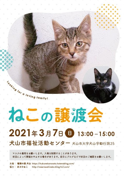 | イベント内容 | 【ココがポイント!】 ★健康診断、ウイルスチェック済み! 20匹ほど参加予定です。 【日時】 3月7日 (日) 13時~15時 【場所】 犬山市福祉活動センター (犬山市大字犬山字勧行洞25) 予約不要 駐車場あり 【ブログでチェックどうぞ】 あさひねこ http://owariasahineko.blog.fc2.com/ 福猫の里 犬山「福猫の里便り」 https://hukunekonosato.hatenablog.com/ 問い合わせ先(福猫の里 犬山) a-saoka.922@outlook.com ーーーーーーーーーーーー 【感染予防対策】 ★入口で手の消毒あり ★マスクの着用をお願いします ★入場制限する場合があります ★猫と猫の間をあけます。 ★保護主との距離も取ります ★定期的に換気をします 【お約束】 当日、会場での猫の引き渡しはしておりません。 後日ご自宅までお届けします。 お試し飼育(トライアル)を1週間ほどして頂き、双方が納得の上で正式譲渡となります。 譲渡の際は、医療費の一部の負担をお願いしております。 (ワクチン代 等) ・ペット可のお住まい ・完全室内飼育、終生飼育 ・適切な医療措置 ・不妊手術の実施と報告 等、お約束があります。 ☆可愛い猫達が暖かい家族を待っています☆ ☆ぜひお越し下さい☆ |