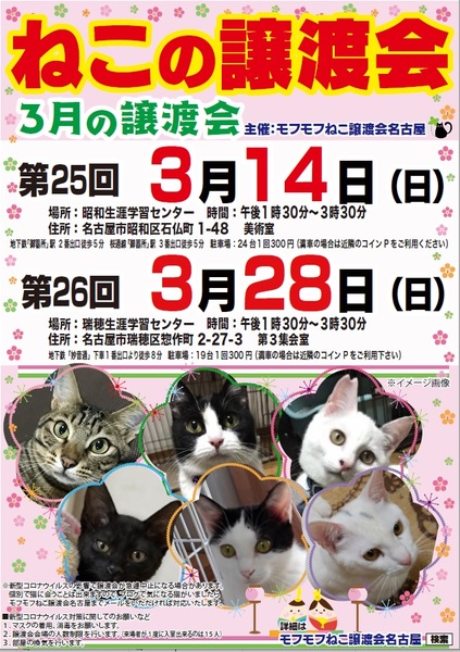 | イベント内容 | モフモフねこ譲渡会名古屋 猫たちの幸せなお家探しのために譲渡会を開催しております。 個人ボランティアの集まりです。 自分たちの出来ることから頑張っております! 一匹でも幸せになれる猫が増えますように 場所 瑞穂生涯学習センター 第3集会室 住所 名古屋市瑞穂区惣作町2-27-3 時間 13時30分~15時30分 交通機関等 地下鉄「妙音通」下車1番出口より徒歩8分 駐車場19台(満車の場合は近隣コインPをご利用ください) 参加猫の情報は下記モフモフねこ譲渡会名古屋ブログにてご確認ください。 https://mofumofuneko4.fc2.net/ 新型コロナウイルス対策として ・会場は換気を定期的に行います。 ・密を避けるため、入場制限をさせていただきます。 ・入口にて手指の消毒、検温をお願いいたします。 ・ご来場の際はマスク着用をお願いいたします。 ・咳・発熱・倦怠感等の体調のすぐれない方はご来場を控えていただきますよう、お願いいたします。 ・新型コロナウイルスの影響により急遽中止になる場合もありますので、モフモフねこ譲渡会名古屋ブログにてご確認の上、ご来場ください。 【譲渡会について】 ・譲渡会は入場無料、予約不要です。お気軽にご参加ください。 ・会場へのお問い合わせはご遠慮ください。 ご質問は下記メールアドレスへお願いいたします。 mofumofuneko4☆gmail.com ☆を@に変更してお問い合わせください。 ・猫の引き取りはしておりません。 ・譲渡会当日に猫をお渡しすることはありません。 ・保護主によって譲渡条件が違う場合があります。 ・参加予定でも譲渡会前にトライアルになる場合があります。 ご希望の猫がいましたらまずはお問い合わせをお願いいたします。 【参加猫について】 ・ノミ駆除、駆虫、トイレ躾、ワクチン3種接種済。 ・年齢や健康状態に応じて、避妊手術を行っております。 ・参加予定で紹介していても当日体調不良等で欠席になる場合があります。 【譲渡の約束事】 ・ペット飼育可の住宅にお住まいの方。 ・完全室内飼育。 ・脱走防止の対策をしていただける方。 ・避妊手術未実施の場合、避妊手術 の実施と報告をしていただける方。 ・ご家族全員が猫を飼うことに同意していること。 ・譲渡後、しばらく定期連絡を入れていただける方。 *お一人暮らしの方、60歳以上の方は、身内の方の保証が必要となる場合がございます。 #名古屋瑞穂区 #瑞穂生涯学習センター #譲渡会 #保護猫 #地域猫 #さくらねこ #tnr #里親募集 #里親募集中 #猫 #ねこ #殺処分ゼロ #買わずに飼おう #モフモフねこ譲渡会名古屋 #ペットショップに行く前に #譲渡会のお知らせ #猫と暮らしたい |