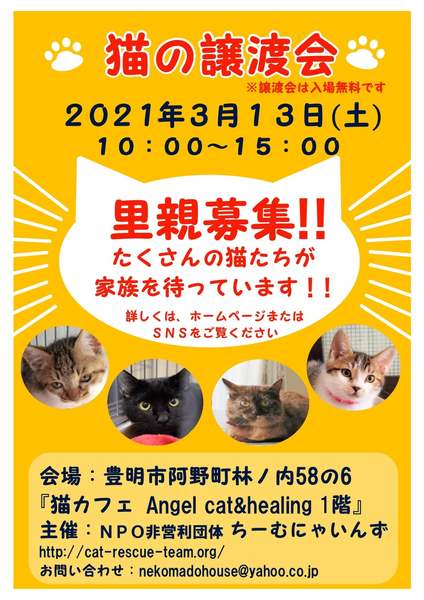 | 開催場所 | 豊明市阿野町林ノ内58-6 猫カフェ「Angel cat healing」さん1階店舗 | ||