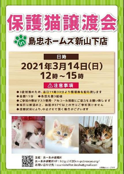 | イベント内容 | 久しぶりの譲渡会開催です! かわいい猫たちが皆さまをお待ちしています(ΦωΦ) ☆★☆★☆★☆★☆★☆★☆★☆★☆★☆★☆★☆★☆★☆★☆★☆★☆★☆★☆ ~3月14日(日)新山下にて譲渡会開催!~ ◎場所・・「島忠ホームズ 新山下店」 神奈川県横浜市中区新山下2丁目12−34 JR根岸線「桜木町駅」より横浜市営バス(8.26.58.148系統)乗車「貯木場前」より徒歩約5分 みなとみらい線「元町・中華街駅」より徒歩約15分 ◎日程・・3月14日(日)(雨天決行) ◎時間・・12時から15時 【14時30分受付終了】 (会場に利用可能な無料駐車場がございます。そちらをご利用くださいませ。) 今回はコロナ対策のため、制限を設けての開催となります。 *3密対策のため、当日11時30分より整理券を配布いたします。 *各回15分 *各回先着3組様 *参加の際は、マスクの着用、アルコール消毒のご協力をお願いいたします。 *当日は検温の上、体温が37度以上の方はご参加いただけません。 *混雑状況により、中止させていただく場合がございます。 ※参加予定の犬猫は体調により参加できない場合があります。ご了承ください。 ☆★☆★☆★☆★☆★☆★☆★☆★☆★☆★☆★☆★☆★☆★☆★☆★☆★☆★☆ |