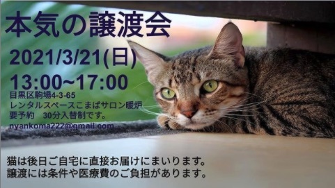 | イベント内容 | 2021/3/21(日) 13:00~17:00 東京都目黒区駒場4-3-65 こまばサロン暖炉 https://fb.me/e/3z3HHmhCl ※必ず主催者様のイベントページをご確認ください。 [主催] 保護猫譲渡会カフェ こまばサロン暖炉 [Facebook] https://www.facebook.com/nyankomaba ※予約優先制となりました。 30分毎入れ替え制 各回5組(10名まで)限定 早くにいらっしゃっても時間前には入れません。 30分で猫ちゃんを選んで、お申し込みの方はお申し込みのお部屋へ移動してください。 お申し込みのない場合はそのままご退出ください。 ご予約は主催者様メールアドレス nyankoma222@gmail.com に、 以下の点を添えてお申し出ください。 ・名前(ニックネーム可) ・希望時間帯 ・人数(なるべく2~3名に抑えて下さい) ・会いたい猫がいれば猫の名前 トラブル防止のため、電話ではなくメールでのご予約をお願いします。 現時点での予約状況はFacebookのイベントページで順次更新されますのでご確認ください。 |