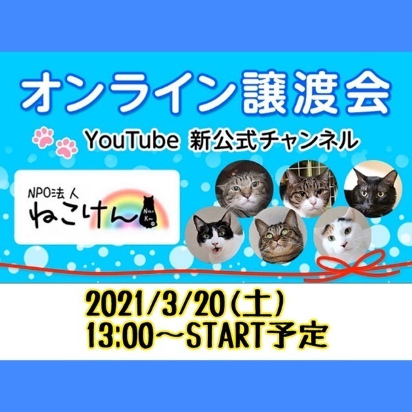 | イベント内容 | ねこけんオンライン譲渡会★YouTube LIVE配信! YouTube『NPO法人ねこけん新公式チャンネル』より配信 https://www.youtube.com/channel/UCkQMHfWUQc-KldxomKcINEA ★チャンネル登録大歓迎!ぜひ、よろしくお願いします★ シェルターや預かりさん宅よりリアルタイムで猫さんをご紹介♪ 譲渡会では緊張で固まってしまう子も多いですが、 普段通りの可愛い様子が見られちゃう!?かも?! ライブ配信中は猫さんへのご質問にも対応させていただきます。 たくさんのご参加お待ちしております! ライブ配信を見逃してしまってもアーカイブ投稿されますので、 いつでも視聴可能です♪ 今後も土日祝日に開催したいと計画中です。 決定次第お知らせしますので、ぜひチャンネル登録お願いします。 -------------------- ペットとしてではなく、生涯家族として猫を迎えて下さる方への譲渡となります。 原則『譲渡会』もしくは『完全予約制個別お見合い』にて正式なお申込みを承っております。 譲渡会には家族を待っている猫さん達がたくさん参加します♪ ▽▲ねこけん定期譲渡会▲▽ ★毎月第2日曜日 12:00〜16:00 島忠ホームズ中野本店 〒164-0014 東京都中野区南台5-24-13 https://www.shimachu.co.jp/shop/tokyo/310.html (注)中野店ではなく中野本店での開催で、最寄駅は方南町駅です。 ※当日11:30より整理券を配布。(各回15分、各回先着3組様) ★毎月第4日曜日 12:00〜16:00 島忠ホームズ仙川店 〒182-0003 東京都調布市若葉町2-1-7 https://www.shimachu.co.jp/gmshop/tokyo/313.html ※当日11:30より整理券を配布。(各回15分、各回先着3組様) ◆必ずお守り頂く事◆ ①終生飼養 ②完全室内飼養 ③年1回のご報告 ④ペット飼育可能な物件にお住まいであること ただし、以下の該当の方は、譲渡出来ない場合がございます。 ※学生、安定的な収入のない方 ※60歳以上の方は、成猫さんを家族に迎え入れることが出来ます。 里親様のご年齢に応じた成猫の譲渡となりますのでご相談ください。 不妊去勢手術・医療費の一部負担をお願いしております。 ※お届けエリアによっては掲載の譲渡費用とは別途、往復高速料金(実費)をご負担いただく場合がございます。 ご希望の猫さんと家族になるまでの流れや、譲渡時にかかる一部ご負担金などの詳細、契約書のサンプルも含め下記URL①②に掲載しております。ご確認ください。 ①譲渡をご希望の方へ https://nekoken.jp/jotokai/joutokibou/ ②ねこさんと家族になるまでの流れ http://nekoken.jp/jotokai/joto-nagare/ なお、譲渡対象エリアは東京近郊(東京都・神奈川県・埼玉県・千葉県)に限らせていただきます。 対象エリア内であっても、遠方の場合アフターフォローの関係上お断りさせていただく場合もございますのでご了承ください。 ※譲渡会日程がご予定と合わず個別お見合いご希望の方は、各募集サイトからのご応募もしくは下記連絡先までお問い合わせください。 —————————— [連絡先] ご質問等ございましたらお気軽にお問い合わせください。 NPO法人ねこけん東京本部 https://nekoken.jp/inquiry/ nekoken@cat.email.ne.jp [ホームページ] http://nekoken.jp [Instagram] https://www.instagram.com/nekoken2222/ [ブログ・ボラ日記・YouTubeなど] https://linktr.ee/nekoken フォロー・チャンネル登録よろしくお願いします! |