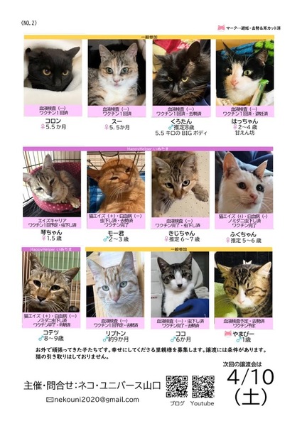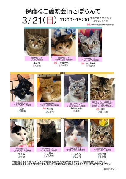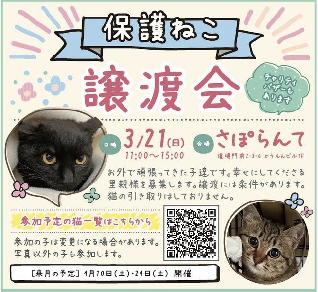 | イベント内容 | お外で頑張ってきた保護猫ちゃんが待ってます。 山口市の『さぽらんて』で「保護ねこ譲渡会inさぽらんて」(ボランティア合同開催)が開催されます。 時間は11時から15時まで。 子猫達は写真で見るより実際に見てもらった方が可愛いと思います。ぜひ足をお運びいただいて、運命の子との出会いを見つけてください。 *譲渡には条件がありますので、気になる子がいましたらお問い合わせください。 *参加予定ねこちゃんは当日変更になる場合があります。 *チャリティーバザーもあります。 *感染症予防対策は会場でも行っておりますが、各自でも宜しくお願い致します。 *画像はほっぷさん作成のものを使用させて頂いております。 |