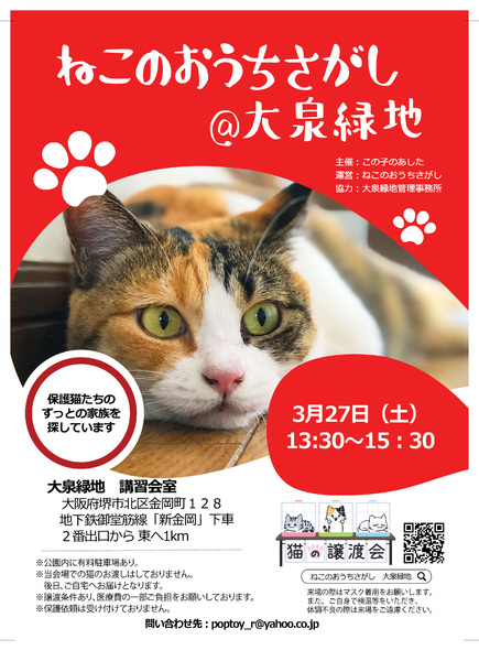 | イベント内容 | 久しぶりに譲渡会開催します^ ^ かわいい保護猫ちゃんたちにずっとのおうちをお願いします! 参加猫情報は、下記のブログにて順次ご紹介していきます♪ https://ameblo.jp/jillrill/theme-10113120111.html ※感染拡大の状況によっては急遽中止となる場合がございます。 ※ご来場の際は必ずマスク着用をお願いいたします。 ※開催時間中、定期的に空間中に消毒液を噴霧いたしますので、あらかじめご了承ください。(無害です) 第5回☆ねこのおうちさがし@大泉緑地 日時 : 2021年3月27日(土) 時間 : 13:30〜15:30 場所 : 大泉緑地 講習会室 〒591-8022 大阪府堺市北区金岡町128 地下鉄御堂筋線「新金岡」2番出口より東へ1km ☆詳しいアクセスについてはこちらでご確認ください→大泉緑地HP www.osaka-park.or.jp ☆公園内に有料のコインパーキングがございます。 (第1駐車場が会場に一番近いです) ☆会場へのお問い合わせは固くお断りします。 (場所をご提供くださるだけなので、参加猫のについてはご存知ありません) ★譲渡には完全室内飼育、同意書への署名・捺印などの条件、医療費の一部負担があります。 ★猫ちゃんは、後日お届けとなります。 当日連れて帰ることはできません。 ★参加予定の猫ちゃんは、里親会の前に里親さまが決定する場合や、体調により不参加となる場合があります。 主催:この子のあした 運営:ねこのおうちさがし 協力:大泉緑地 問い合わせ先 : poptoy_r☆☆☆yahoo.co.jp (☆☆☆を@に変更してください) ※スジュールにより来場できないけど気になる子がいらっしゃる場合、お問い合わせ頂きましたら、アンケートにお答え頂いたのち保護主さんにお繋ぎいたします。 |