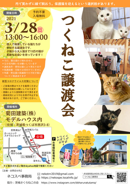 | イベント内容 | 個人ボランティアが保護している猫たちの譲渡会です。 子猫から大人猫まで、約20匹の猫が参加予定です。 密を避けるため、入場制限をかけながら実施いたします。 込み合ってまいりましたら、お車でお待ちいただくこともございます。 感染症対策にご協力ください。 *** モデルハウスの1階と2階を使い余裕ある展示をしているので、 参加者さんからはゆっくり見て回れると好評です。 猫をはじめて迎える方、今はまだ迎えられないけど保護猫を考えているという方もお気軽にお声がけください。 準備するものや、ライフスタイルに合ったマッチングをご提案いたします。 参加する猫は個人宅で保護している猫たちです。 医療をかけ、家猫修行をさせ、ピカピカにして新しいお家へと巣立たせます。 大切な「命」ですので、猫を譲渡するにあたり、 一定のお願いやお約束、医療費の一部をご負担いただくことをご了承ください。 ペットショップのほかに、保護猫を迎えるという選択肢を加えてください。 身寄りのない猫たちが、ずっとの家族との出逢いを待っています。 *** 「つくねこ譲渡会」 ・日時:3月28日(日)13:00~16:00 ・場所:菊田建築モデルハウス(茨城県つくば市西沢3-8) ・予約不要・入場無料 ・駐車場あり ・参加猫紹介 https://nekospe.localinfo.jp/pages/3110908/page_201908041108 ◉ネコスペ事務局 ネコスペ事務局は、個人で活動するボランティアさんの後方支援部隊です。 保護猫・保護犬の譲渡会やイベントを企画・運営しています。 https://nekospe.localinfo.jp |