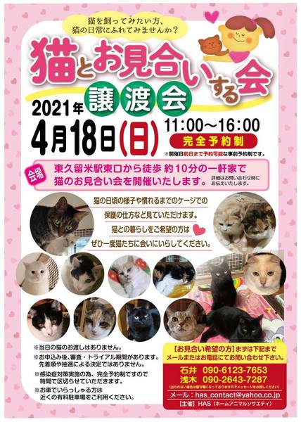 | イベント内容 | 新型コロナウイルス感染症から参加者とスタッフの安全を確保するため、完全予約制で一組づつ保護シェルターにお越しいただき、猫たちに会っていただくかたちで再開しています。 普段暮らしている場所なので、猫たちもリラックスしてお迎えできます。 マスクの着用など感染症対策を万全にして、できる限り少人数でお申込みください。 |