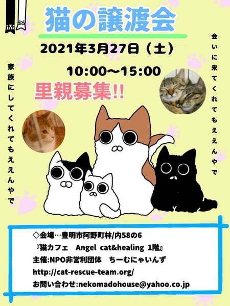 | イベント内容 | 2021年3月27日(第4土曜)の10時~15時に、豊明市内の猫カフェ「Angel cat healing」さん、同建物一階・道路側空き店舗部分にて、『保護猫の譲渡会』を開催します!! 当日は、数多くの保護猫さんが参加(15匹前後)を予定しております♬ ※見学無料・来場予約不要 猫さんをお探しの方や、これから猫を飼ってみたいと考えられている方、更に色々な『ネコ話』を聞いてみたい方など、是非お気軽にお越しください! ※新型コロナウイルス感染症拡大防止の為、来場時のマスク着用・検温・アルコール消毒液での除菌・少人数(2~3組)ごとの入場・送風機による場内換気・お車での順番待ちなど、様々な制約が生じてしまいますが、何卒ご協力の方をよろしくお願いいたします。 ※コロナ3密対策のため、事前予約のない《他団体のメンバー様》につきましては、ご来場や相談等、一切の対応をお断りさせていただいております。 [主催] ちーむ にゃいんず (NPO 非営利団体) [開催日時] 2021年3月27日(第4土曜)10時~15時 [譲渡会場] 愛知県豊明市阿野町林ノ内58-6 猫カフェ『 Angel cat healing 』さん 同建物1階・道路側空き店舗部分にて ※駐車場有り(10台) ◎ちーむにゃいんず紹介ページ 新しくなりました! [ちーむにゃいんず公式サイト] http://cat-rescue-team.org/ 現在も随時更新中です!(旧公式HP) [ちーむにゃいんずamebaページ] https://team-nyainz.amebaownd.com/ 地域に愛される保護猫団体を目指します! [瀬戸観光協会公式HP内「ちーむにゃいんず」紹介ページ] http://www.seto-marutto.info/member-post/teamnyainz/ フォローをお願い致します [ちーむにゃいんずFacebookページ] https://www.facebook.com/teamnyainz [ちーむにゃいんず Twitter] https://twitter.com/nyains_seto お問合せ先 [譲渡会や里親さん希望の方のお問合せは↓] nekomadohouse@yahoo.co.jp [保護猫活動ボランティアにご参加希望の方は、こちらへ↓] nekomado1@yahoo.co.jp ★只今、保護猫ボランティアのメンバーを大募集中です! 現在のところ、主に瀬戸市内中心部と豊明市内で保護猫の譲渡会を定期開催致しておりますが、愛知・岐阜・三重を中心にした中部地方全域にその活動エリアを拡大中ですので、少し離れた方でも全然OKです! ※経験不問(未経験の方でも、サポートさせていただきます!) ・譲渡会当日の各サポーターさん(受付・場内案内・保護主さんのサポートなど) ・譲渡会以外の日の宣伝活動(各媒体での宣伝・チラシ&募金箱等の設置先紹介など) ・チビ猫さんのミルクボランティア ・子猫さん&成猫さんの預かりさん ・保護猫活動及びTNR活動時の捕獲・保護作業 その他、何らかの保護猫活動にメンバーとして協力していただける方は、下記のメールアドレスの方まで、お問い合わせください。 《お問合せ先》 NPO非営利団体 ちーむ にゃいんず 共同代表 南 貴博 まで↓ nekomado1@yahoo.co.jp ★NPO非営利団体「ちーむにゃいんず」 ・瀬戸観光協会指定 会員登録団体 ・瀬戸市社会福祉協議会 登録団体 ・瀬戸市民活動センター 登録団体 ・豊田市動物愛護センター登録団体 ・名古屋市動物愛護センター登録団体 など |