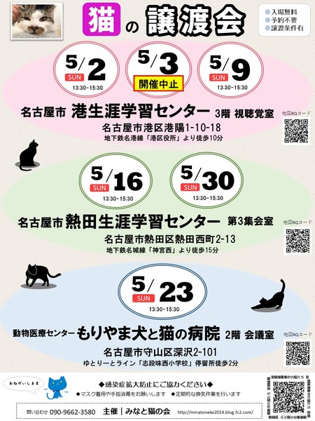| イベント内容 | 【5月3日譲渡会は開催中止となりました】 急遽の変更でご迷惑をおかけいたします 大変申し訳ございません ○次回以降の譲渡会予定 日時:2021年5月9日(日)13:30-15:30 場所:港生涯学習センター 3階 視聴覚室 名古屋市港区港陽1-10-18 地下鉄名港線「港区役所」駅より徒歩9分 日時:2021年5月16日(日)13:30-15:30 場所:熱田生涯学習センター 第3集会室 名古屋市熱田区熱田西町2-13 地下鉄名城線地下鉄「神宮西」駅より徒歩15分 日時:2021年5月23日(日) 13:30-15:30 場所:動物医療センター もりやま犬と猫の病院 新館2階 会議室 愛知県名古屋市守山区深沢2-101 ゆとりーとライン「志段味西小学校」バス停留所 徒歩2分 日時:2021年5月30日(日)13:30-15:30 場所:熱田生涯学習センター 第3集会室 名古屋市熱田区熱田西町2-13 地下鉄名城線地下鉄「神宮西」駅より徒歩15分 ◎主催者ブログ みなと猫の会 ~こぴっと猫だより~ http://minatoneko2014.blog.fc2.com/ ◎参加者のブログ myままさんブログ「にゃんこの宝箱」 http://wagayamama.cocolog-nifty.com/jiru/ 犬白ママさんブログ「犬白日記」 http://k531.blog25.fc2.com/ uzumakinecoさんブログ「猫ときどき雨」 http://uzumakineco.blogspot.jp/ sion1226さんブログ「さとおやさがし」 http://sion1226.blog.fc2.com/blog-entry-1.html ■上記ブログに会ってみたい猫がいた!でも参加予定猫に入ってない、 どうすればいいの? ■譲渡会当日は都合が悪くて… それ以外の日に猫とお見合いがしたい! などのお問い合わせは minatonekonokai@gmail.com まで 〇感染症の拡大防止にご協力願います ※会場入出時の手の消毒にご協力ください ※定期的に換気作業を行います ※マスク等の装着を推奨しております ☆★個性豊かな猫たちが皆様をお迎えします★☆ 猫とスタッフ一同、お待ちしております |