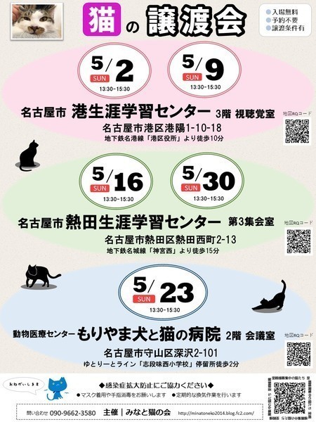 | イベント内容 | =みなと猫の会 第283回譲渡会のお知らせ== 新しい家族を待つ猫たちに 会いに来ませんか? ◆ペットショップへ行く前にぜひ譲渡会へ◆ トイレトレーニングや 基本的な健康診断を終わらせた 猫たちが大集合! 子猫15~20匹、ジュニア猫&オトナ猫7~10匹参加予定です ○主 催 みなと猫の会 ○日 時 2021年5月30日(日) 13:30~15:30 ○場 所 熱田生涯学習センター 第3集会室 愛知県名古屋市熱田区熱田西町2-13 地下鉄名城線「神宮西」駅 徒歩15分 ※専用駐車場有(利用料:終日300円) ※お問い合わせは会場ではなく minatonekonokai@gmail.comもしくは 090-9662-3580 まで ○参加猫について ・参加している猫は、ワクチンや駆虫等の基本治療を済ませています。 また、年齢に応じて避妊去勢手術を行っています。 ・参加予定猫が体調不良などで急遽不参加になることもあります。 参加猫一覧→http://minatoneko2014.blog.fc2.com/blog-entry-1565.html ○ご来場の皆様へ ・譲渡会の見学は入場無料・予約不要です。 ・当日に猫をお渡しすることはありません。 後日ご自宅までお届けに伺います。 ・一週間から二週間のトライアル期間後、正式譲渡となります。 ・トライアル及び譲渡の際には 完全室内飼い・ご家族の同意・脱走防止策・ アンケート記入など諸条件がございます。 ・里親様には治療費の一部ご負担をお願いしております。 これ以上不幸な猫を増やさないための 治療費とさせて頂きますので何卒ご理解ください。 ・非会員の個人保護者も参加しています。 譲渡条件やトライアルは猫の保護者に準じます。 ・譲渡会の流れ http://minatoneko2014.blog.fc2.com/blog-entry-11.html ○参加猫情報は随時更新中! http://minatoneko2014.blog.fc2.com/blog-entry-493.html ○猫に関する相談も受け付けています ねこについての困りごと、トラブルなどを抱えている方、 相談へいらっしゃいませんか。 ○次回以降の譲渡会予定 決まり次第お知らせいたします ◎主催者ブログ みなと猫の会 ~こぴっと猫だより~ http://minatoneko2014.blog.fc2.com/ ◎参加者のブログ myままさんブログ「にゃんこの宝箱」 http://wagayamama.cocolog-nifty.com/jiru/ 犬白ママさんブログ「犬白日記」 http://k531.blog25.fc2.com/ uzumakinecoさんブログ「猫ときどき雨」 http://uzumakineco.blogspot.jp/ sion1226さんブログ「さとおやさがし」 http://sion1226.blog.fc2.com/blog-entry-1.html ■上記ブログに会ってみたい猫がいた!でも参加予定猫に入ってない、 どうすればいいの? ■譲渡会当日は都合が悪くて… それ以外の日に猫とお見合いがしたい! などのお問い合わせは minatonekonokai@gmail.com まで 〇感染症の拡大防止にご協力願います ※会場入出時の手の消毒にご協力ください ※定期的に換気作業を行います ※マスク等の装着を推奨しております 写真1枚目 こたら ♂ 2ヶ月 小柄なボディーですがとても元気な パワフル男子です 写真2枚目 モカ ♀ 2ヶ月 好奇心旺盛で無邪気です 天真爛漫なホンワカ女子 ☆★個性豊かな猫たちが皆様をお迎えします★☆ 猫とスタッフ一同、お待ちしております |
