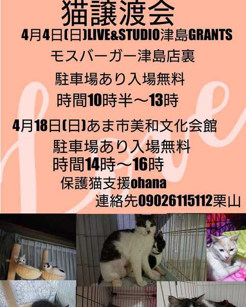| イベント内容 | 今月4日(日)は津島GRANTSにて(10時半~13時)、18日(日)はあま市美和文化会館にて(14時~16時)保護猫の譲渡会を開催します。多頭崩壊、津島市某公園一斉捕獲プロジェクト、南本町保護プロジェクトと、色々な現場からの猫ちゃんが、参加します。大人猫さん多めですが、大人猫ほど、手がかかりません。皆様どうか、よろしくお願い致します。 | ||